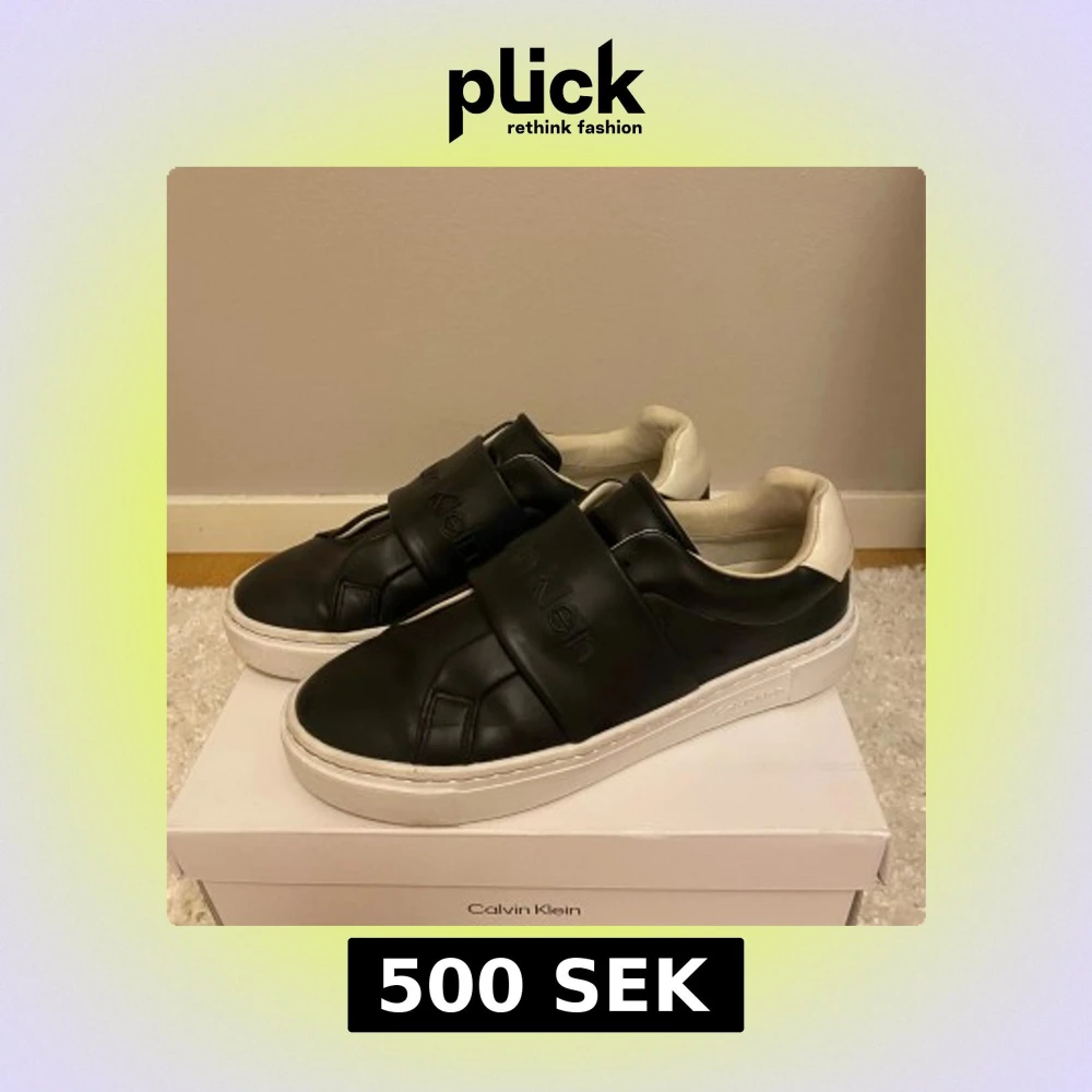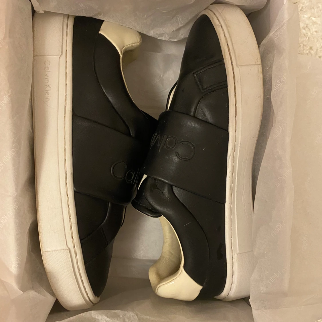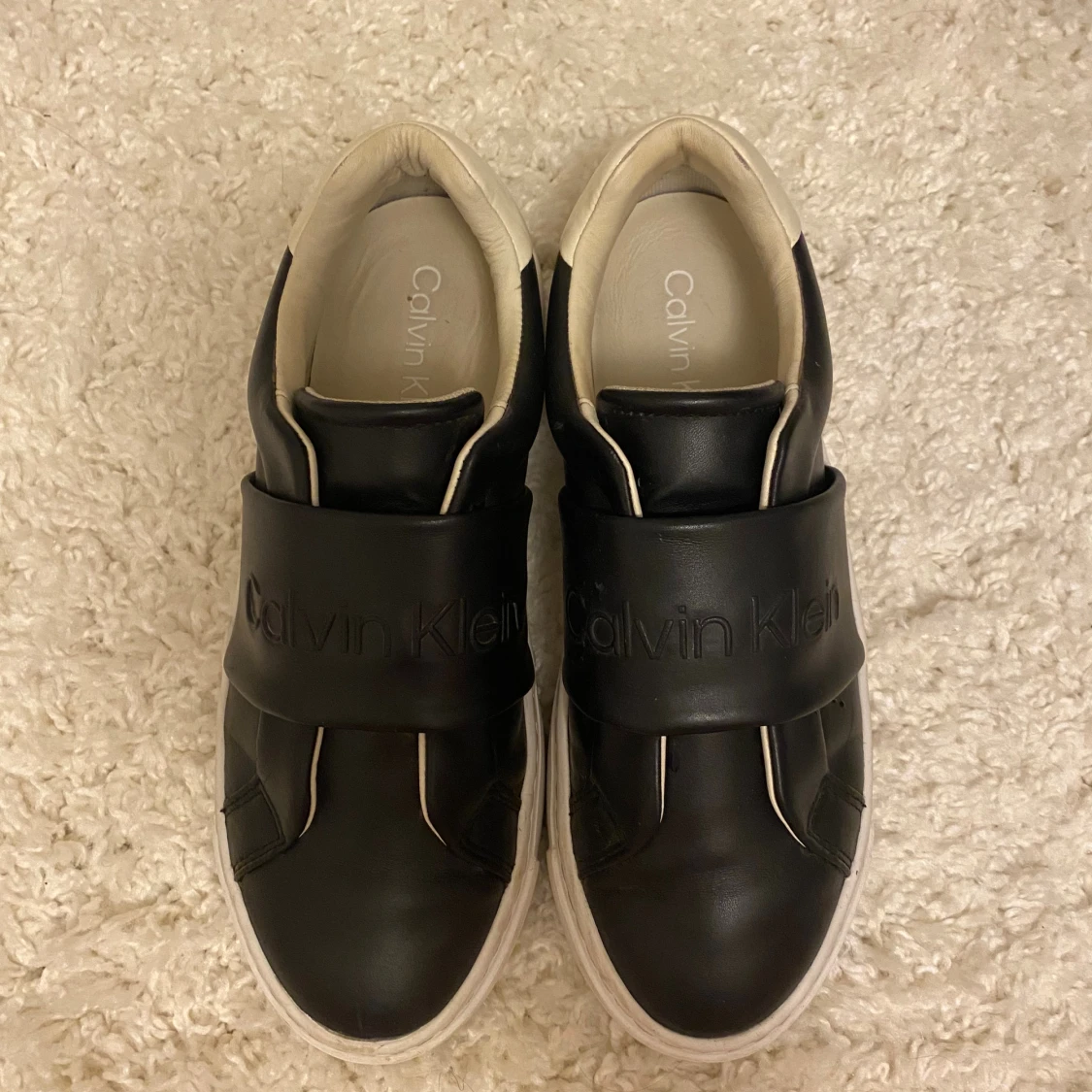 Snygga svarta sneakers från Calvin Klein med breda remmar över foten där loggan är präglad.