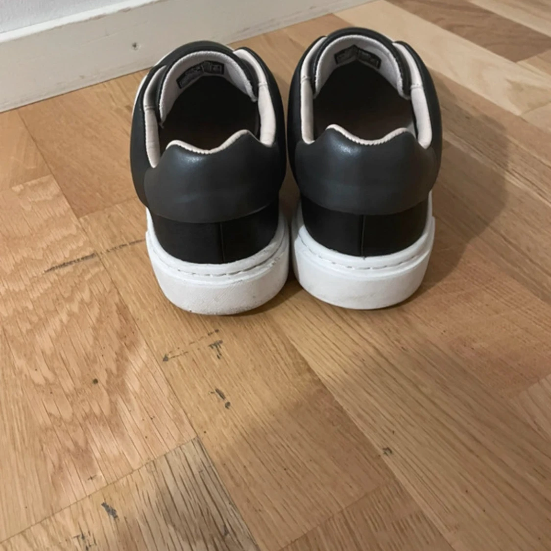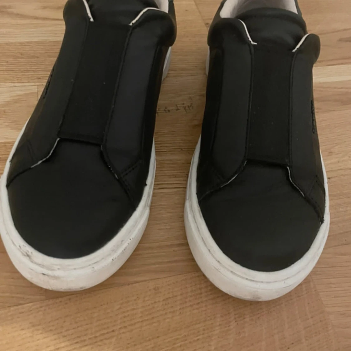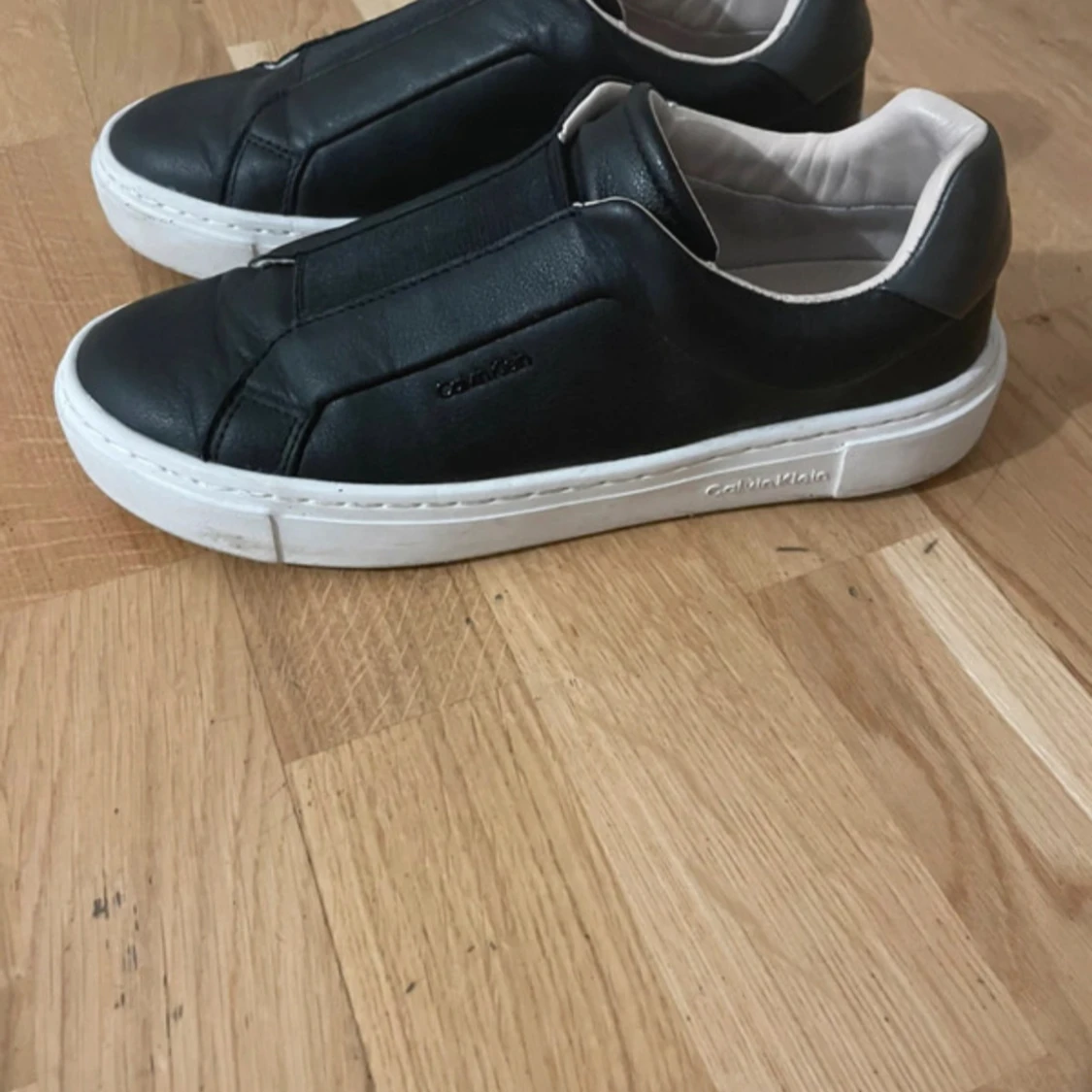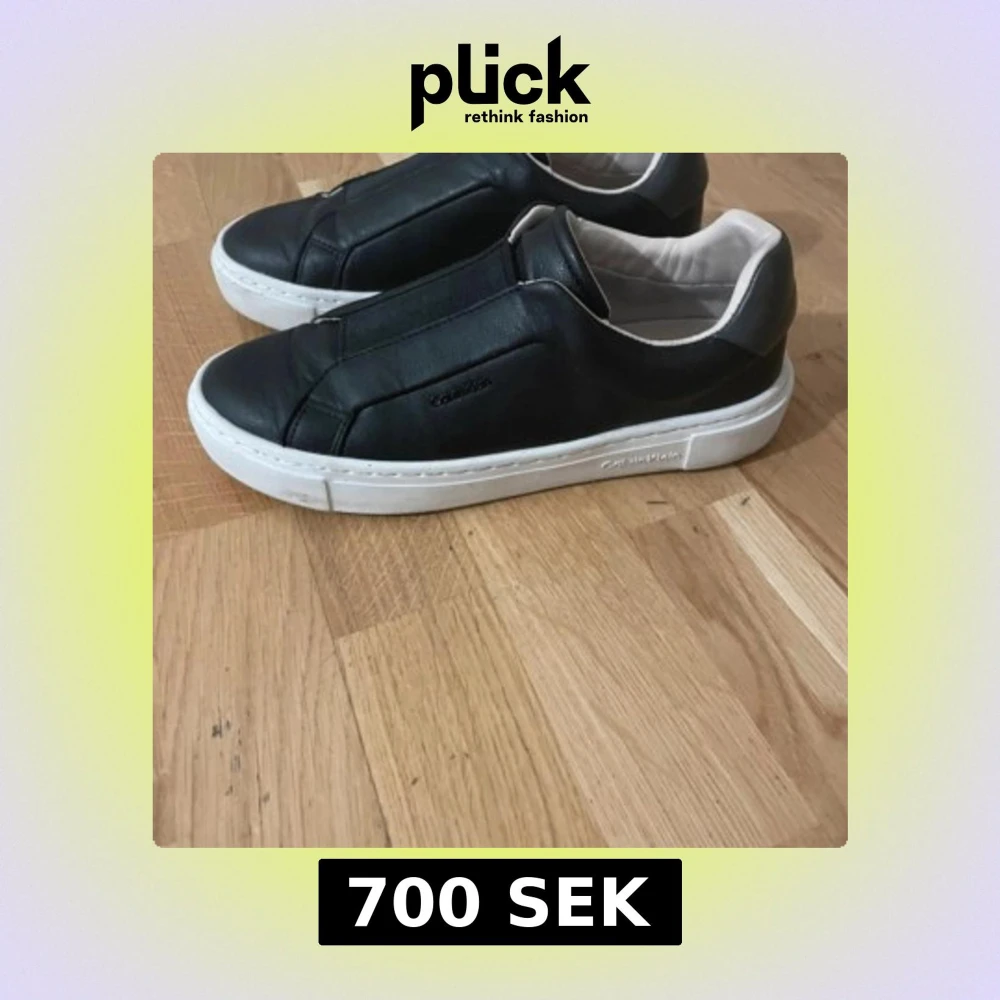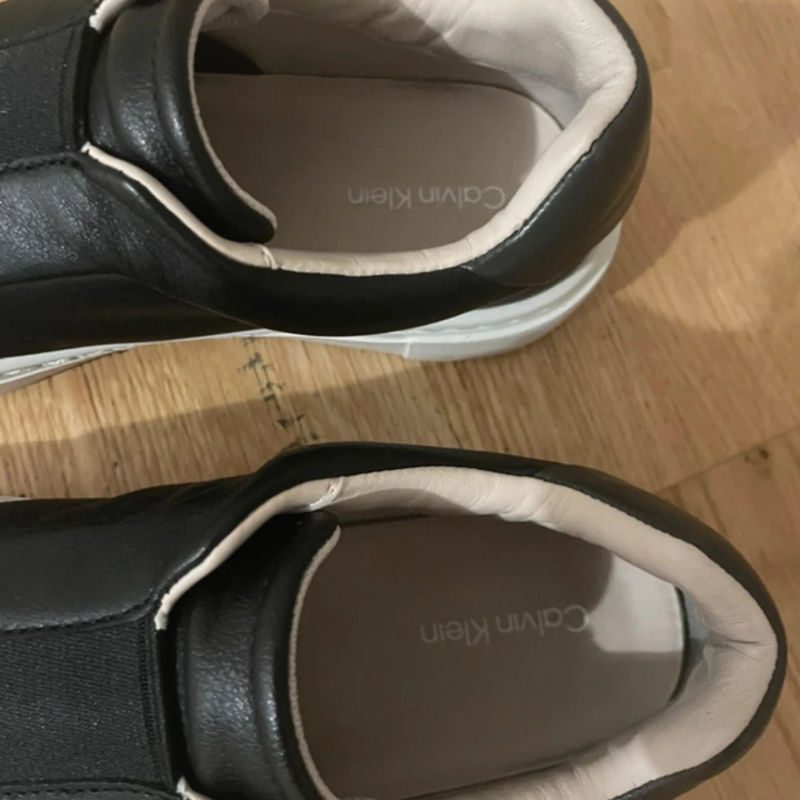 Stilrena svarta sneakers från Calvin Klein i skinn med vit sula och diskret logga på sidan. Skorna har en minimalistisk design utan snörning och en mjuk, ljus insida för extra komfort. Perfekta för dig som gillar en clean och modern look.