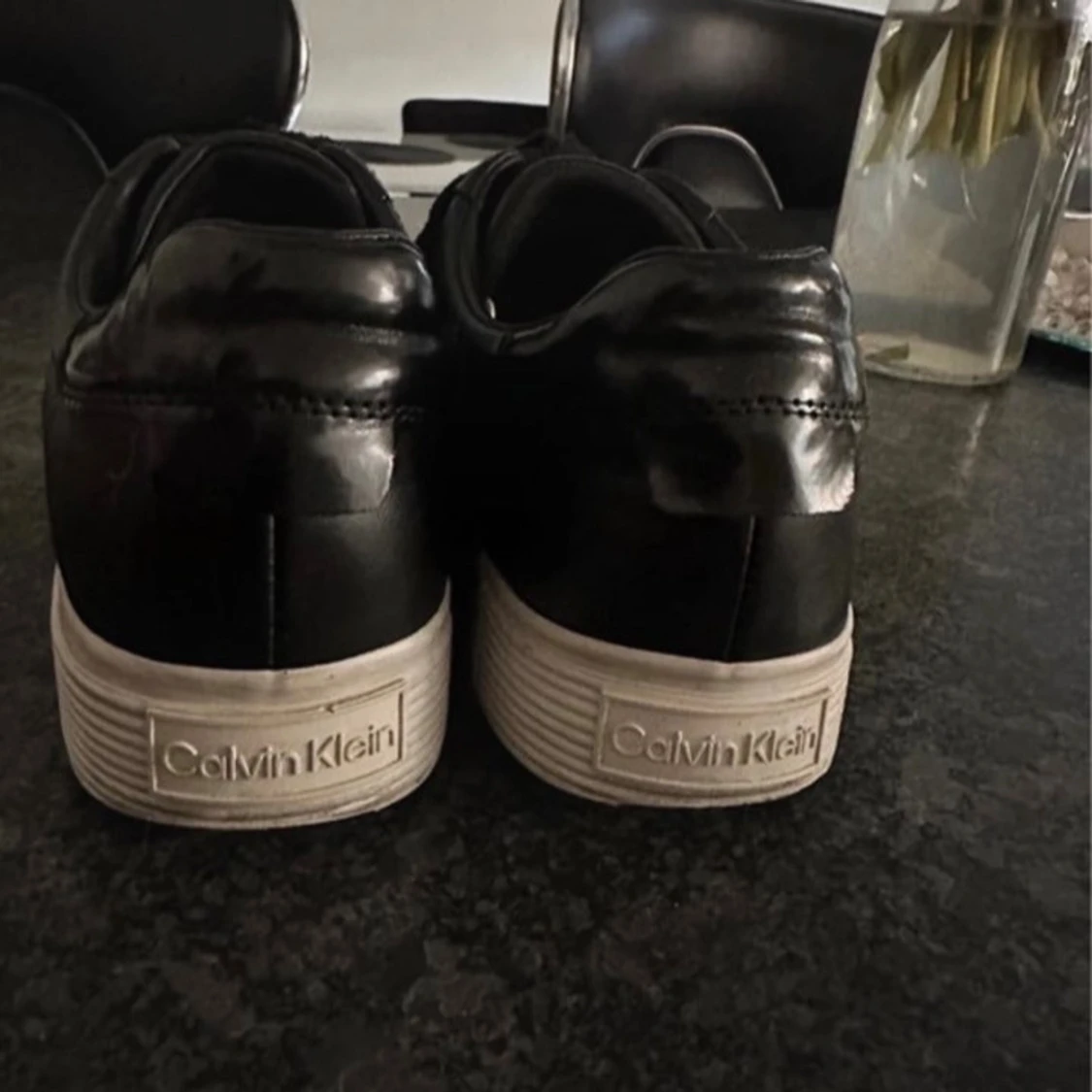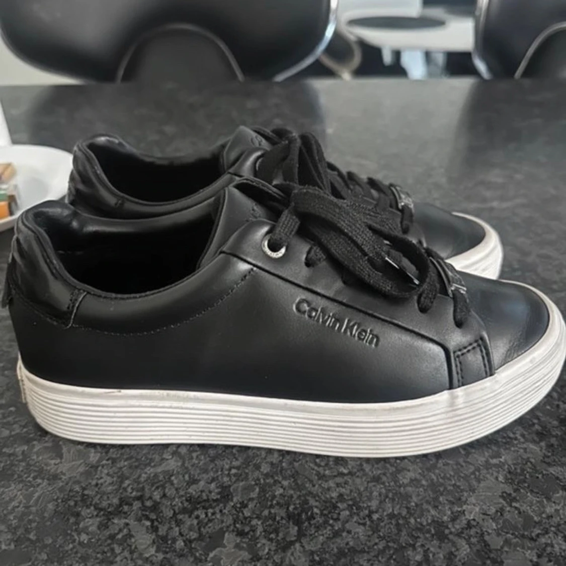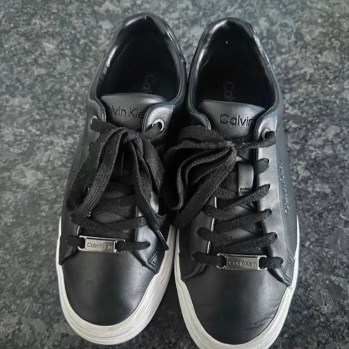 Snygga svarta sneakers från Calvin Klein med vit platt sula och klassisk rund tå. Skorna har svarta snören, diskret logga på sidan och detaljer i metall vid snörningen. Tillverkade i skinnliknande material för en stilren look. Pris kan diskuteras.