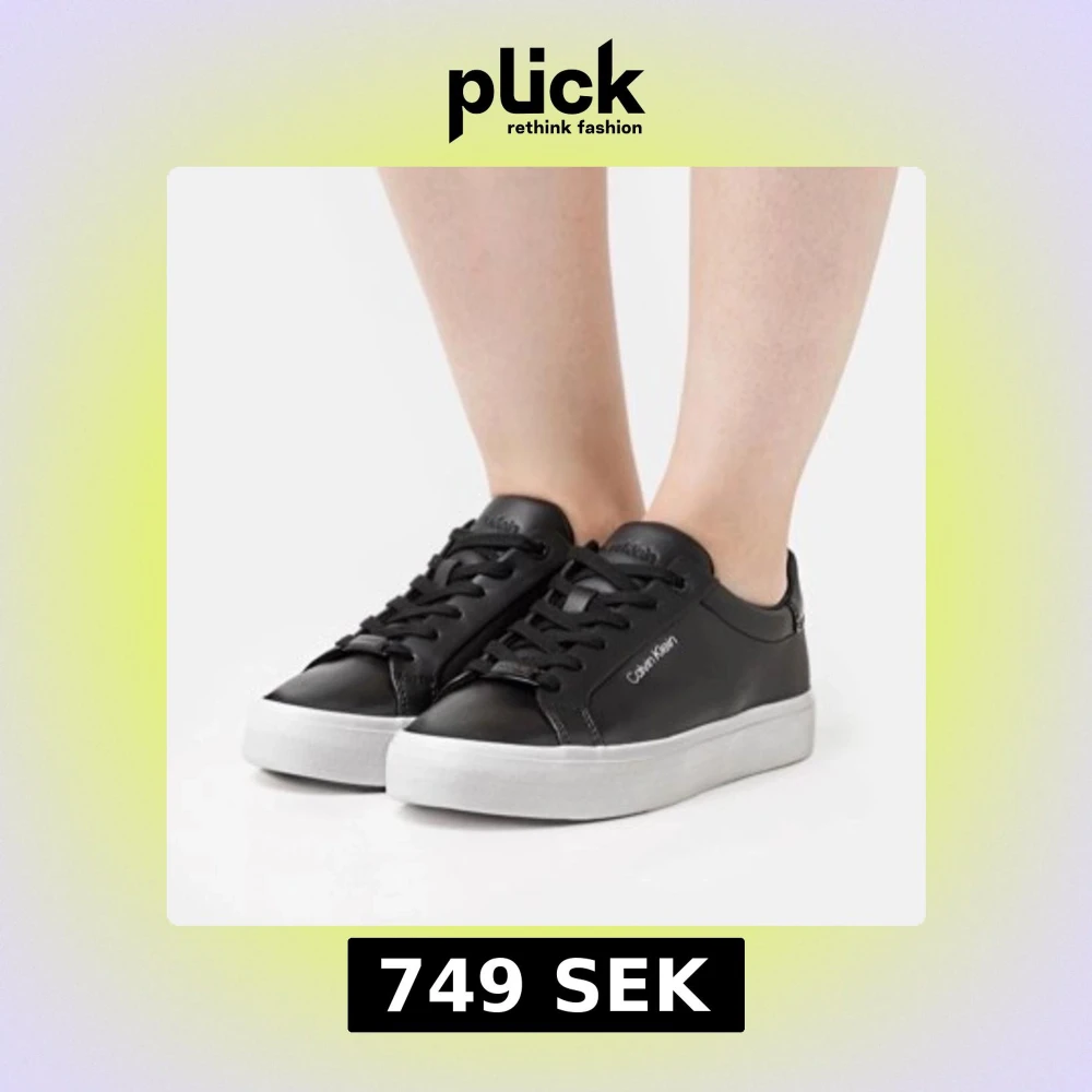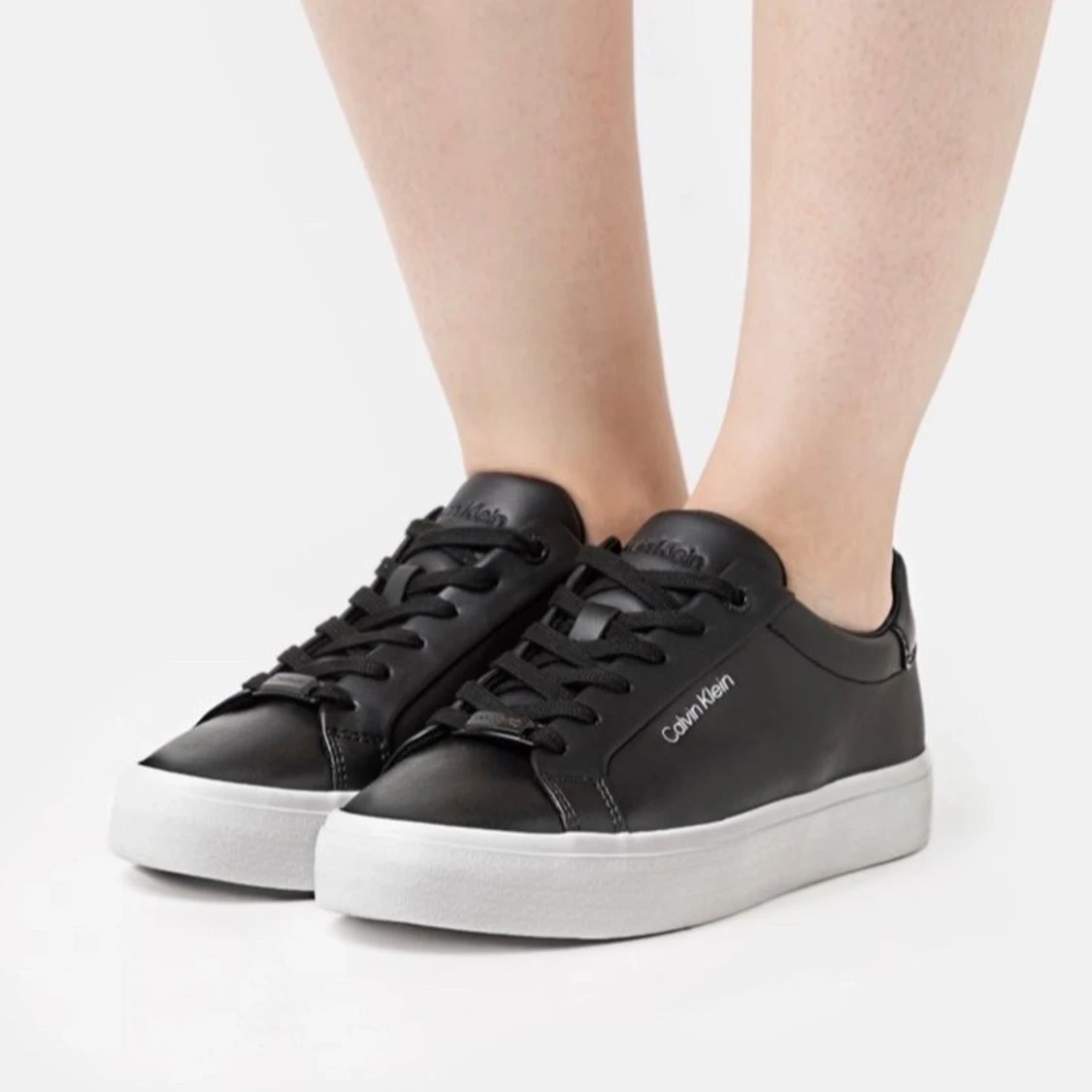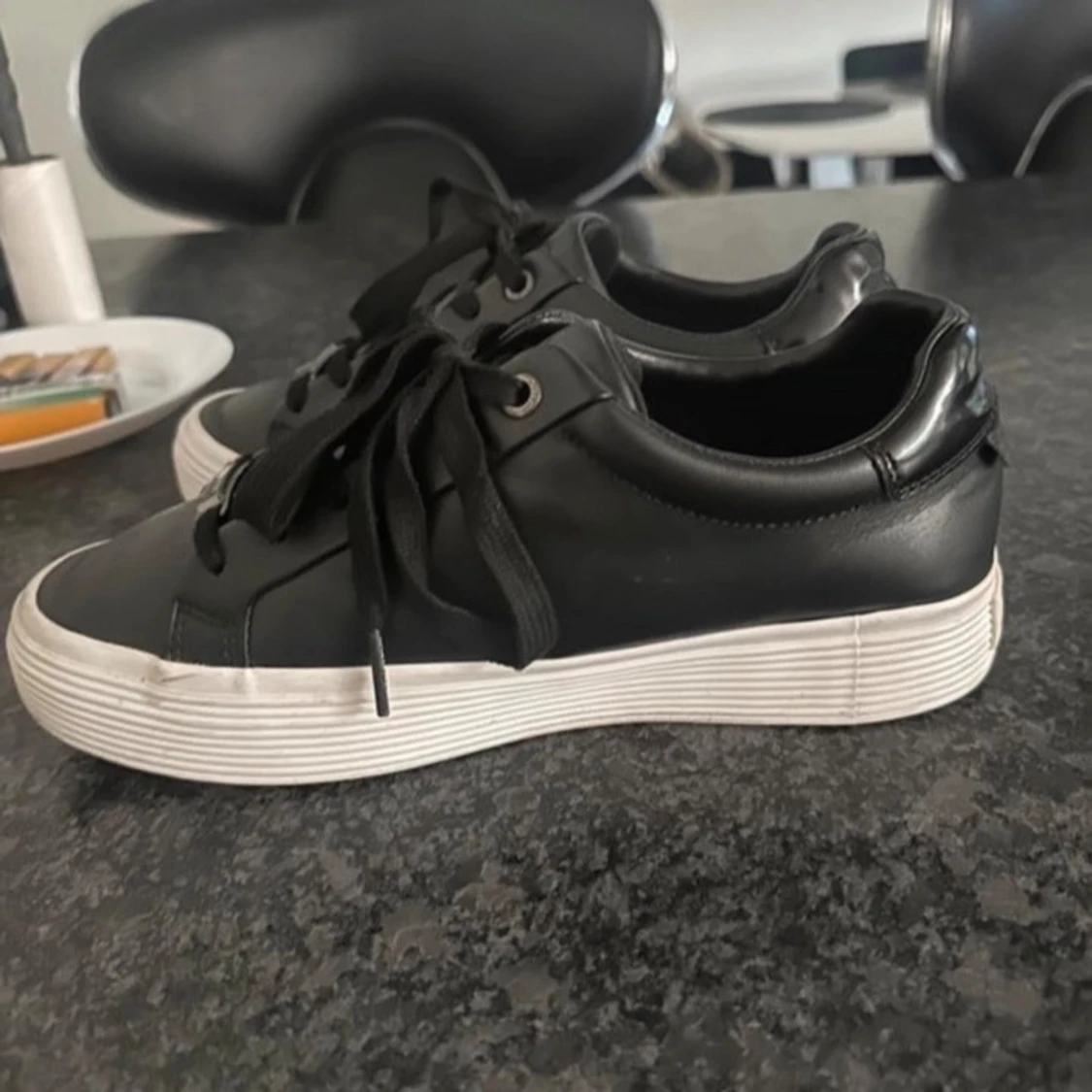 Snygga svarta sneakers från Calvin Klein med vit platt sula och klassisk rund tå. Skorna har svarta snören, diskret logga på sidan och detaljer i metall vid snörningen. Tillverkade i skinnliknande material för en stilren look. Pris kan diskuteras.