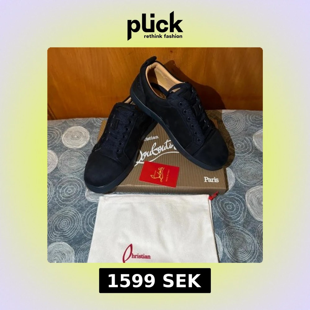 Snygga svarta sneakers från Christian Louboutin i mocka med klassisk röd sula. Skorna har rund tå, platt sula och snörning. Diskret broderad logga på hälen och lyxig känsla med beige innersida. Perfekta för dig som vill sticka ut med stil.
