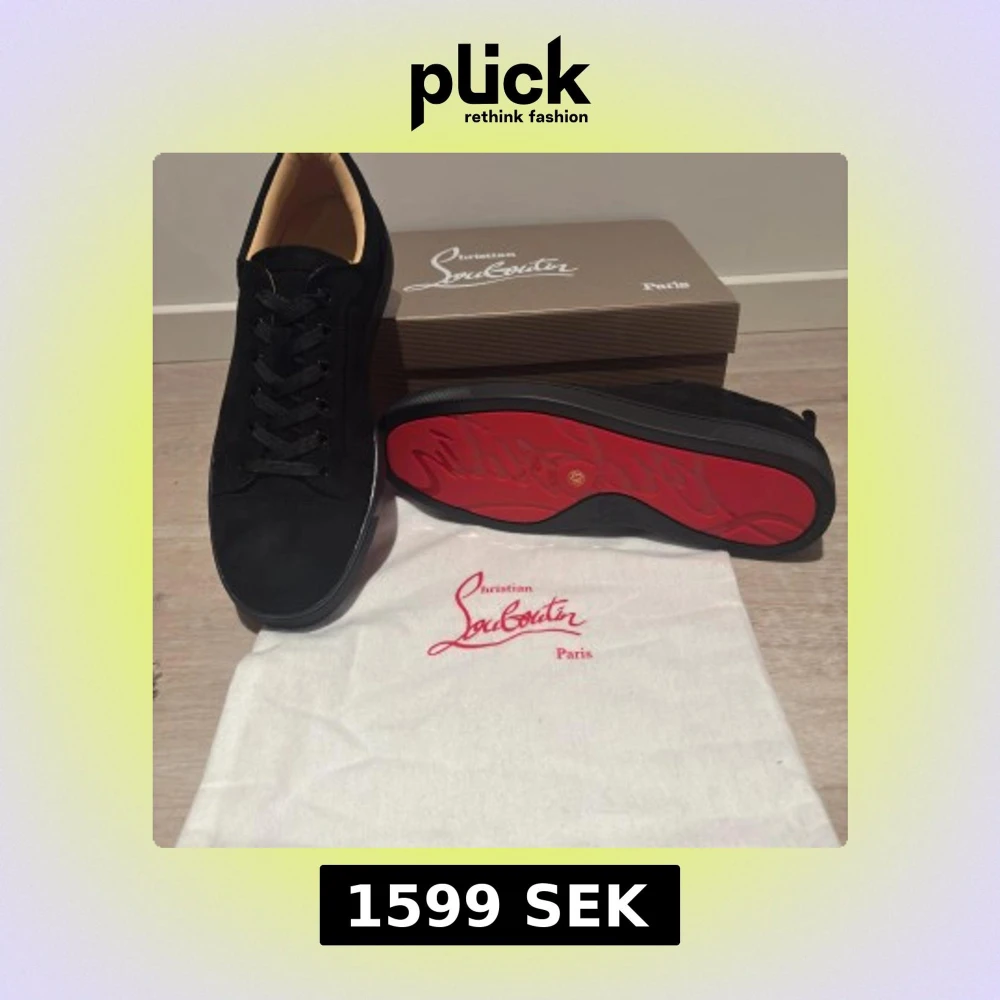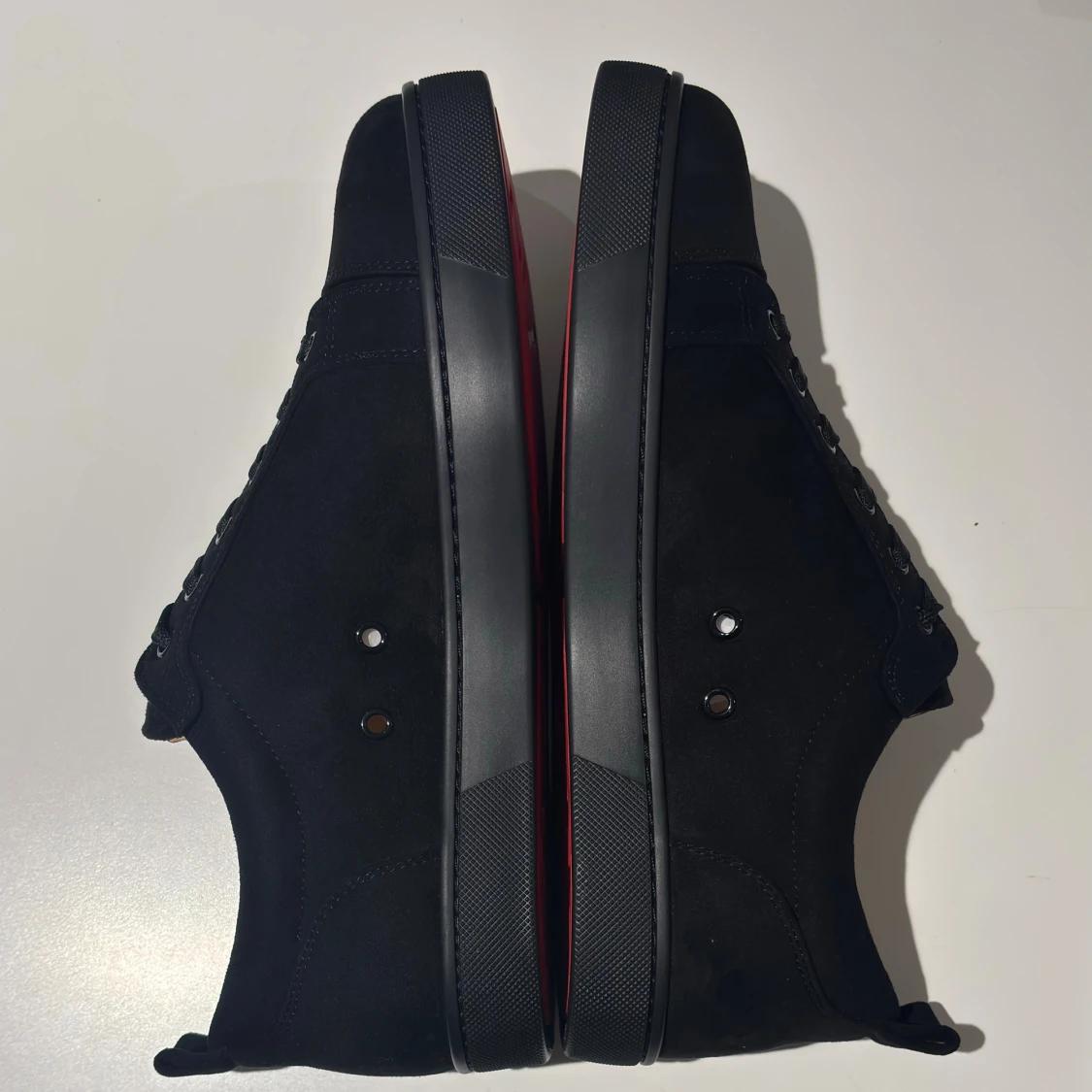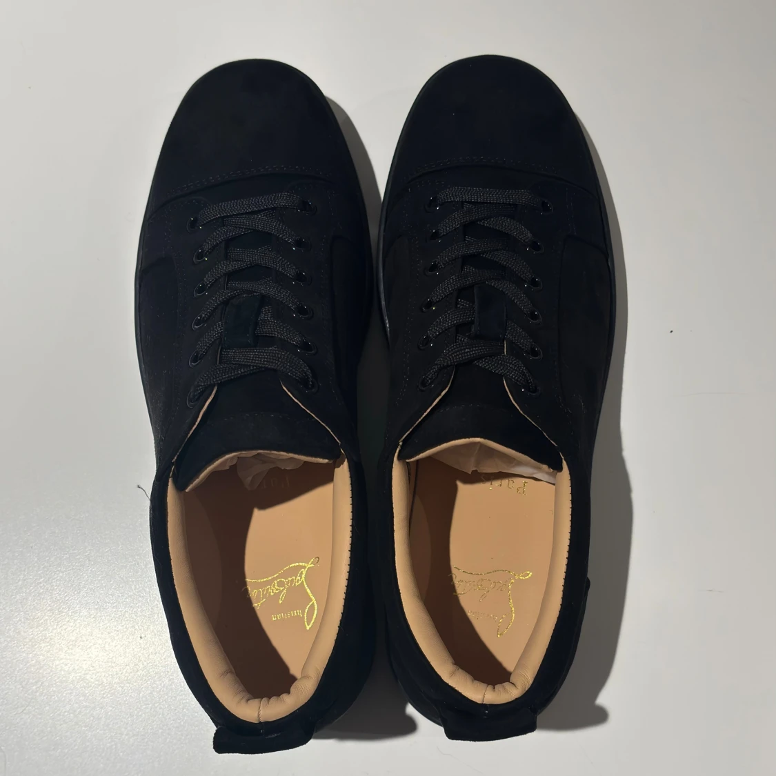 Snygga svarta sneakers från Christian Louboutin med klassisk röd sula och rund tå. Skorna har snörning och är tillverkade i mocka med mjukt beige foder. Perfekt för dig som vill ha en exklusiv och stilren look med en ikonisk detalj under foten.