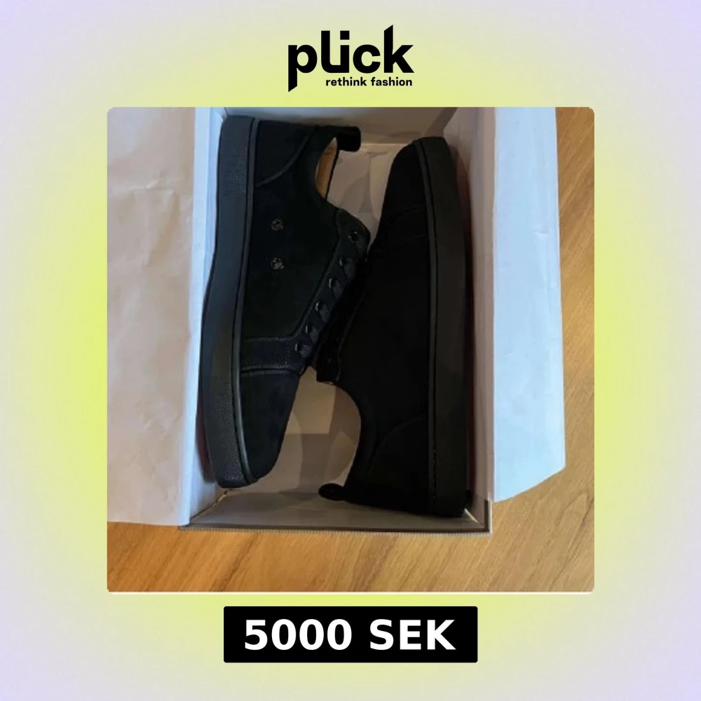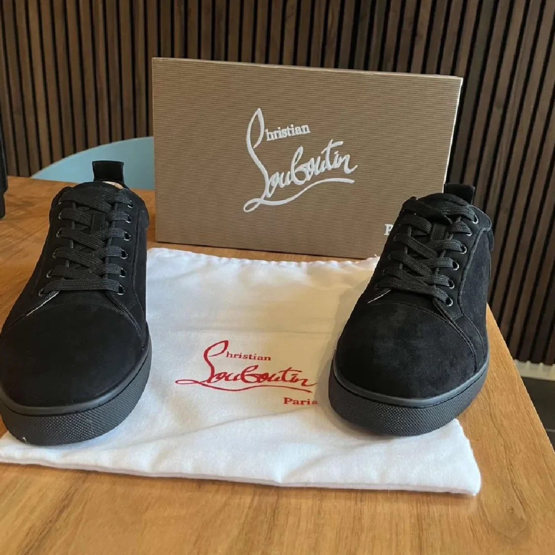 Snygga svarta sneakers från Christian Louboutin med den ikoniska röda sulan. Skorna har en stilren design med snörning och är tillverkade i mocka. Perfekta för en trendig look.