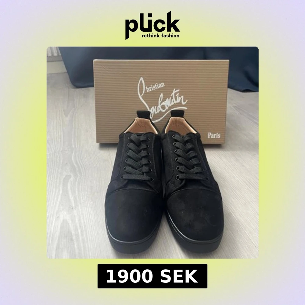 Snygga svarta sneakers från Christian Louboutin i mocka med diskret broderad logga på hälen. Skorna har rund tå, platt sula och klassisk snörning. Kommer med originalkartong, dustbag och äkthetsbevis. Perfekta för dig som vill ha en stilren och lyxig look.