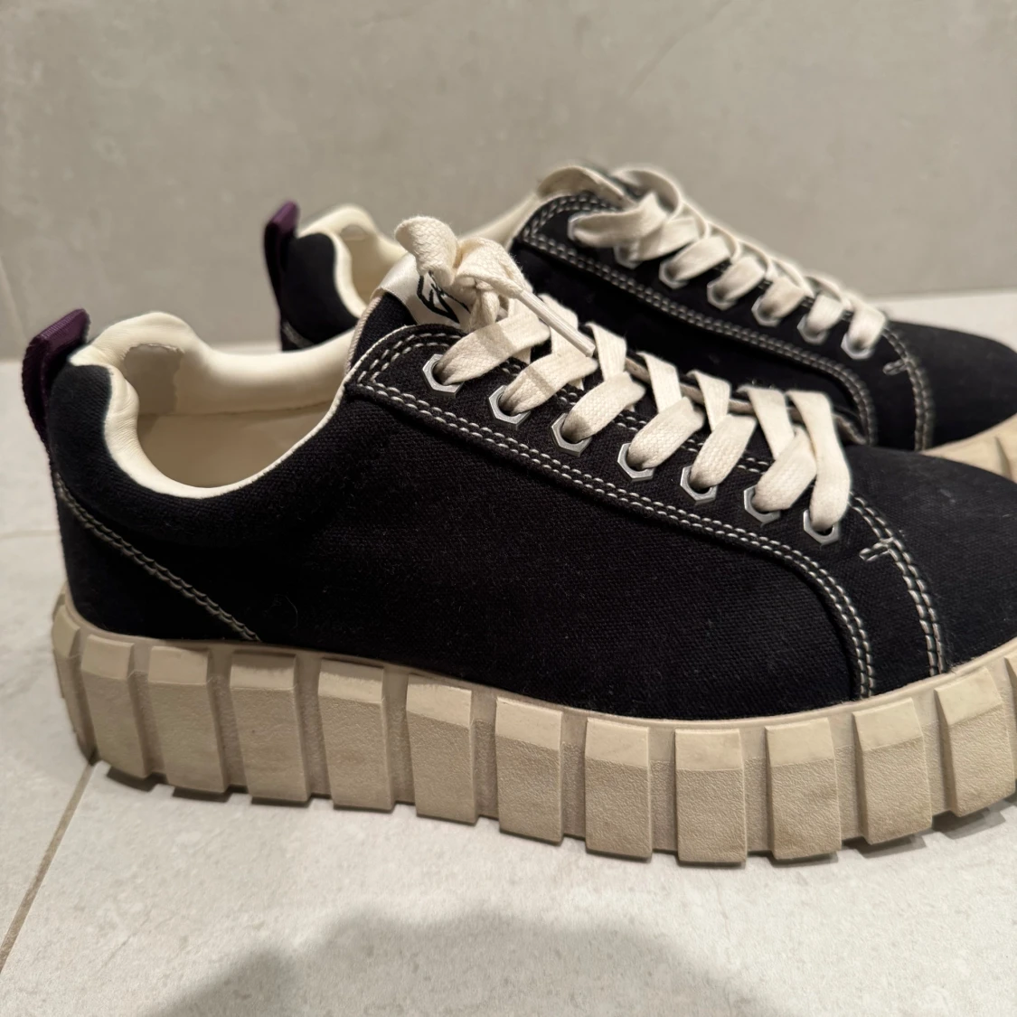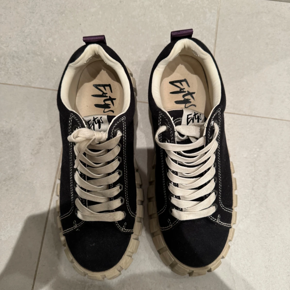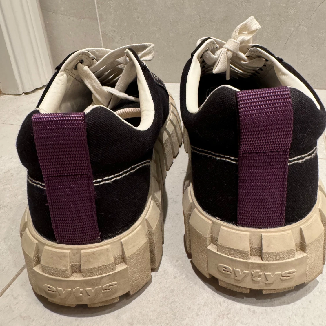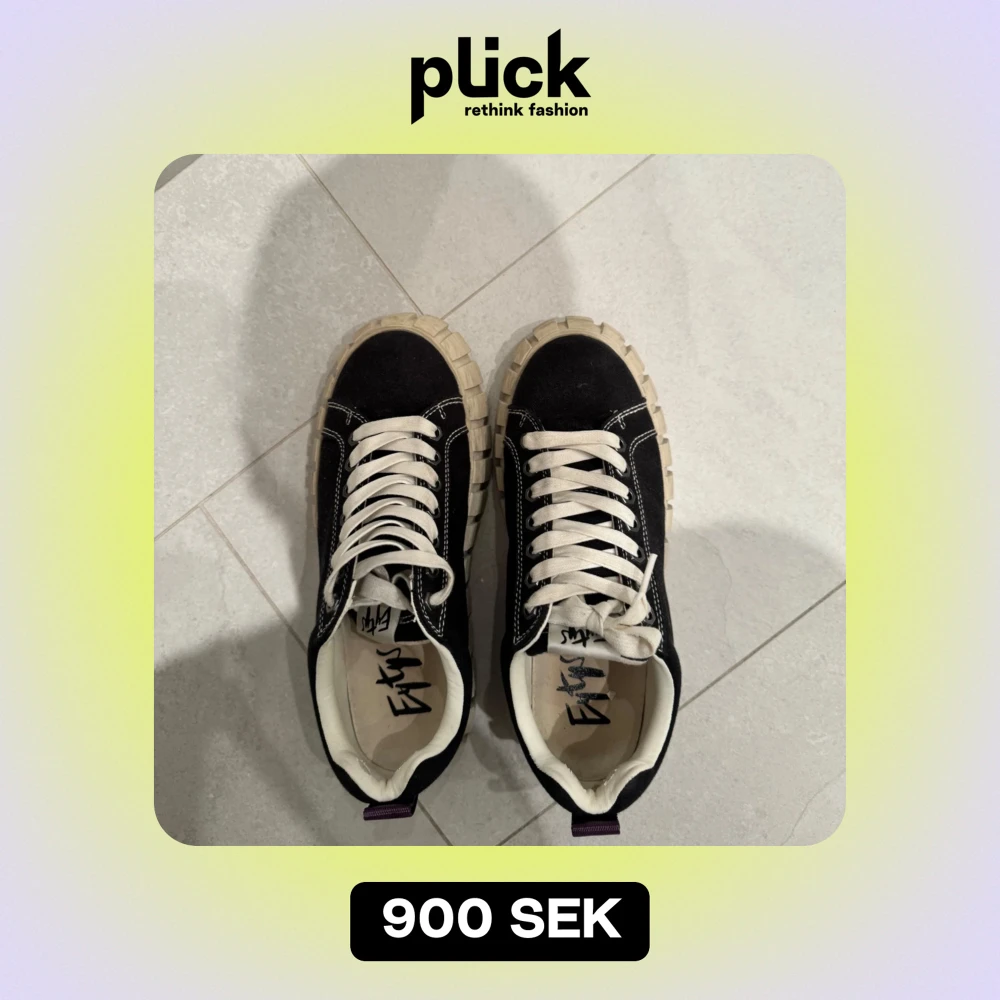 Snygga svarta sneakers från Eytys med vit sula och snörning. Skorna har en unik, grov sula och lila dragflik baktill. Perfekta för en stilren look. ÄLSKAR DE men tyvärr är de för stora:(