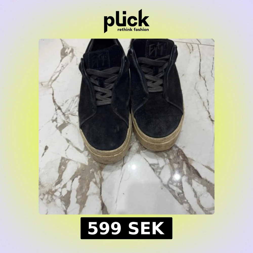 Säljer ett par svarta sneakers från Eytys med lila detalj på hälen och beige sula. Skorna har snörning och är gjorda i mocka med en klassisk rund tå. Perfekta för dig som gillar stilrena och trendiga sneakers med en twist.