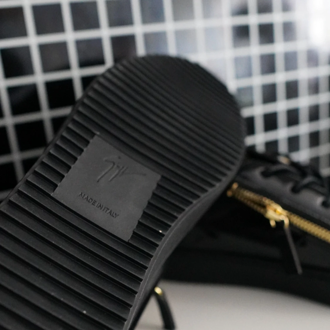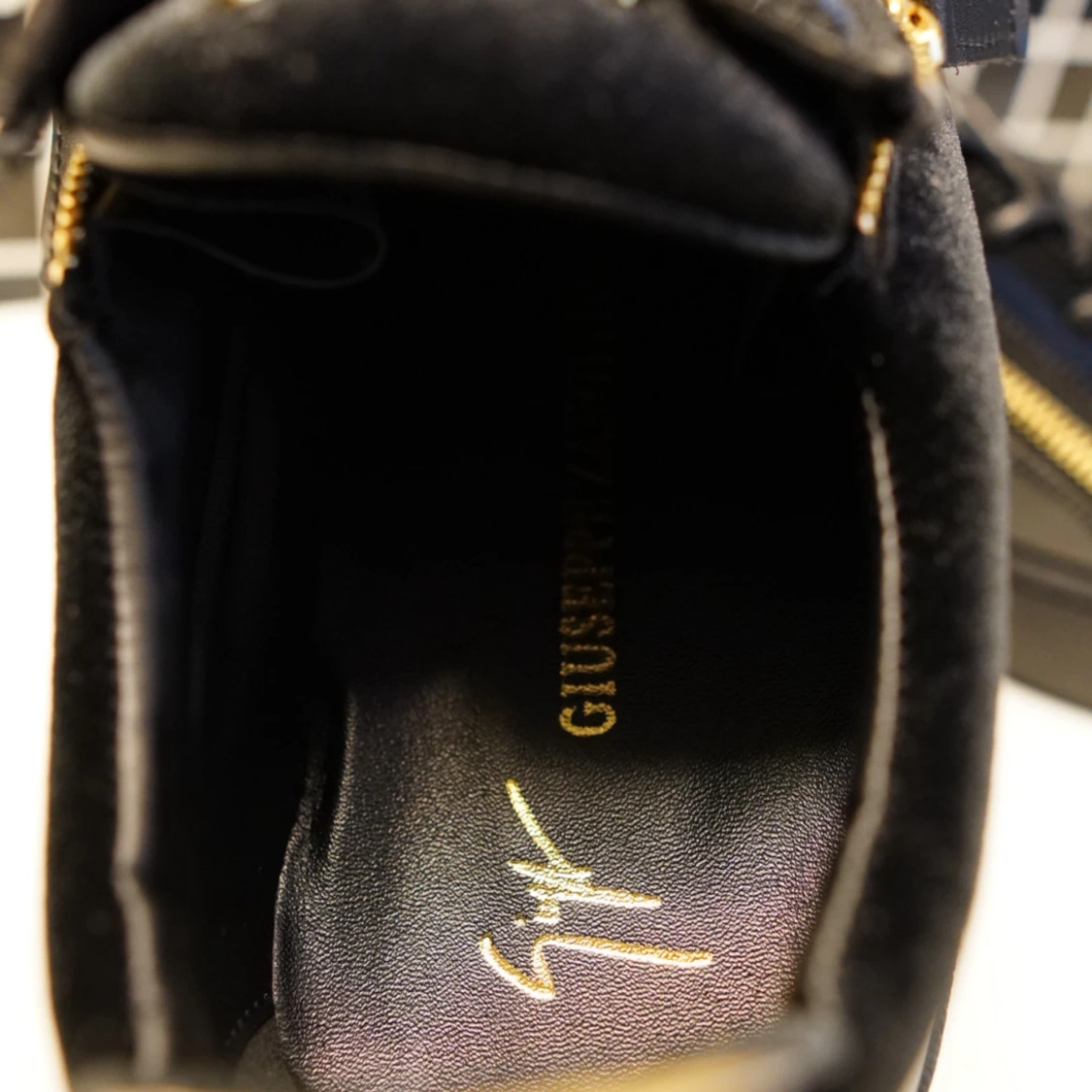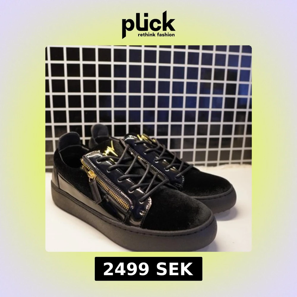 Snygga svarta sneakers från Giuseppe Zanotti med lyxiga gulddetaljer, dragkedjor på sidorna och snörning. Skorna har en mix av sammet och lackdetaljer som ger en exklusiv känsla. Perfekta för dig som vill sticka ut med stilrena och trendiga skor.