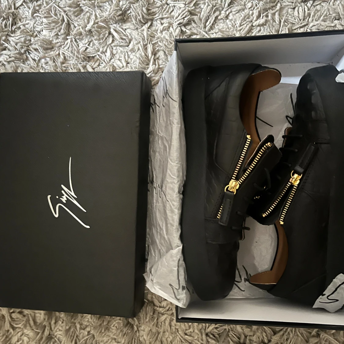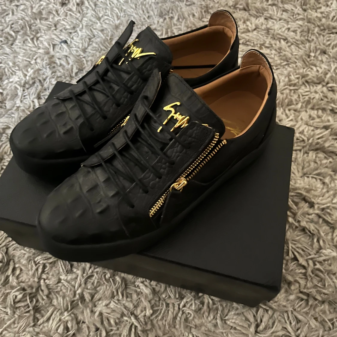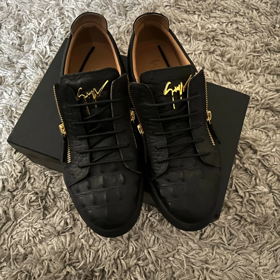 Exklusiva svarta sneakers från Giuseppe Zanotti med croco-mönstrad skinnstruktur, guldfärgade dragkedjor och logga på plösen. Skorna har snörning, rund tå och platt sula. Lyxig känsla med snygga detaljer som sticker ut.