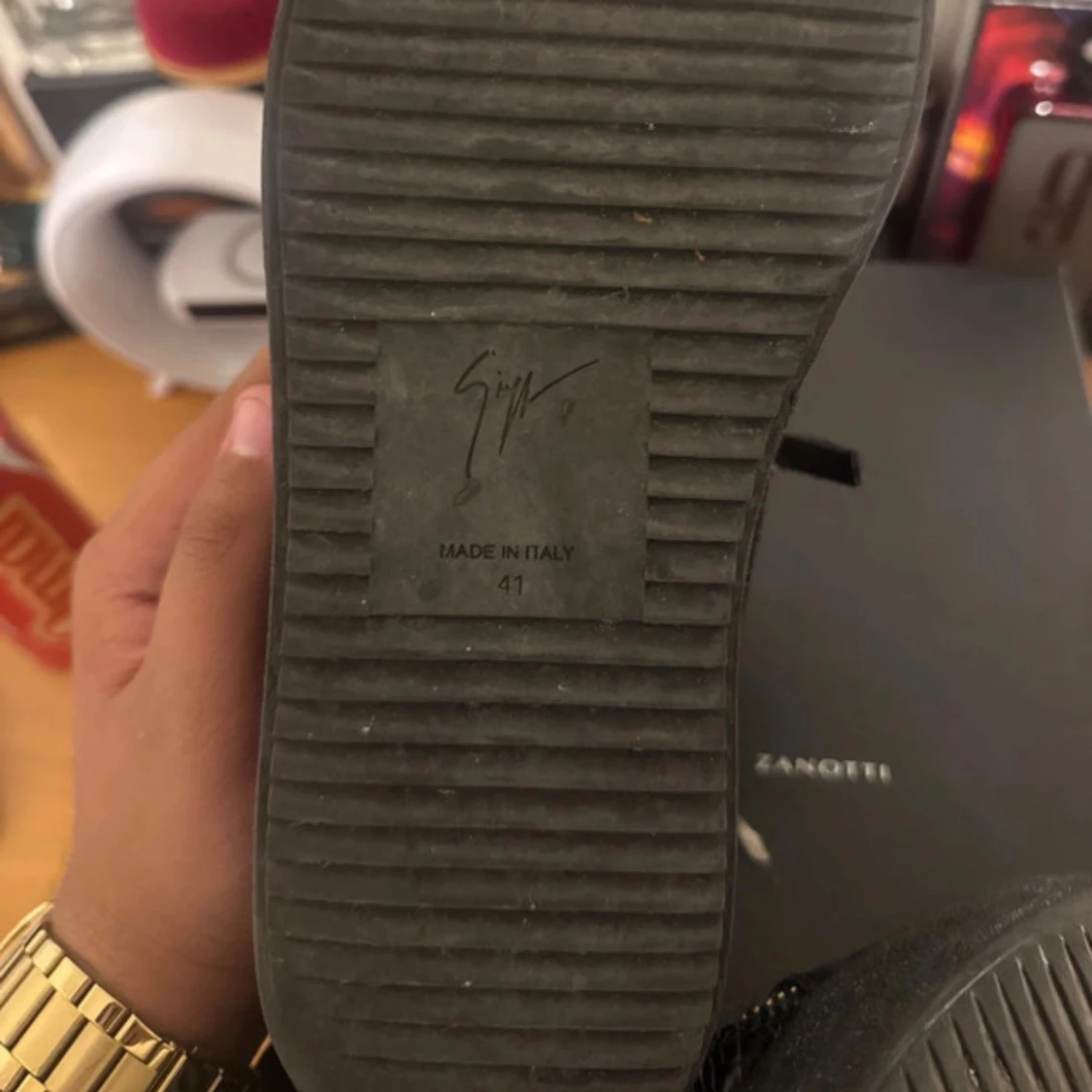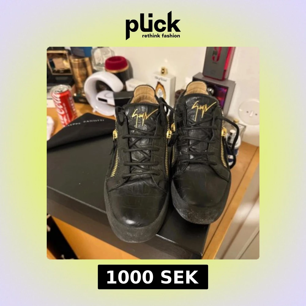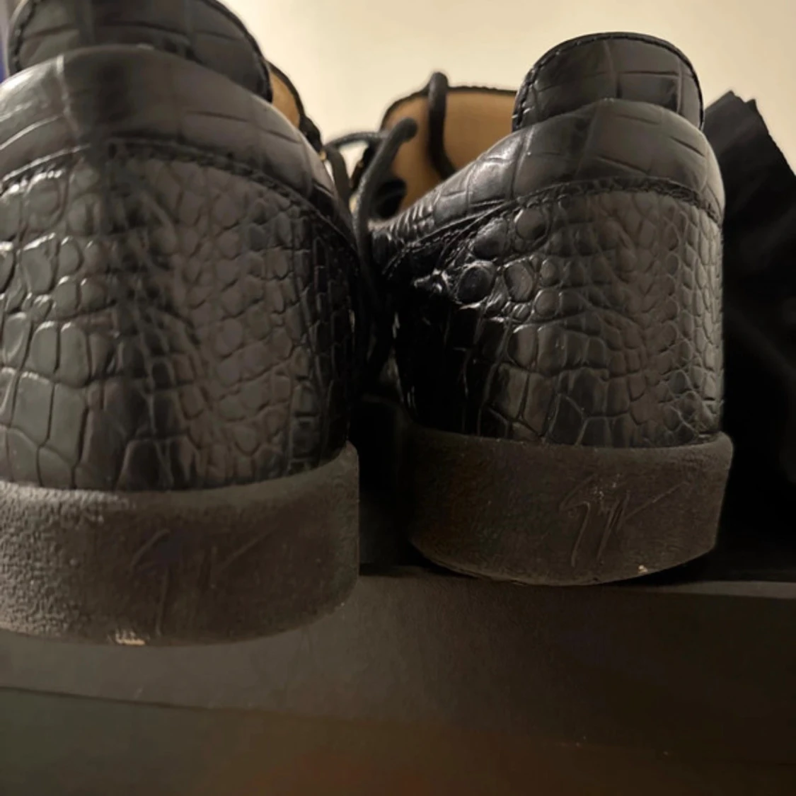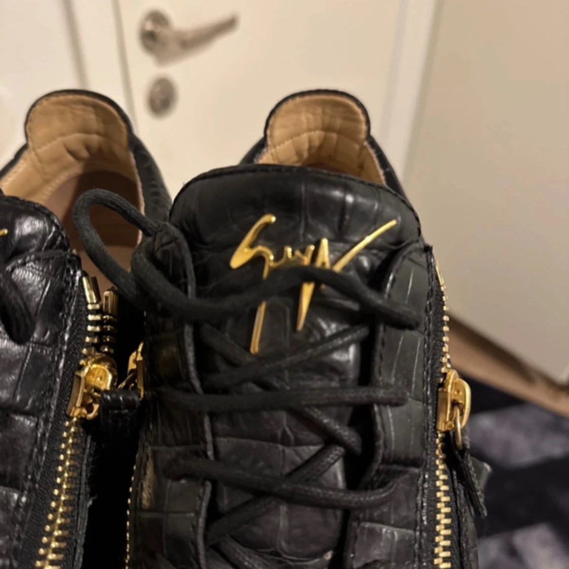 Säljer ett par svarta sneakers från Giuseppe Zanotti i lyxigt skinn med krokodilpräglad yta. Skorna har guldfärgade dragkedjor på sidorna, svart snörning och den ikoniska loggan i guld på plösen. Riktigt snygga och unika skor för dig som vill sticka ut.