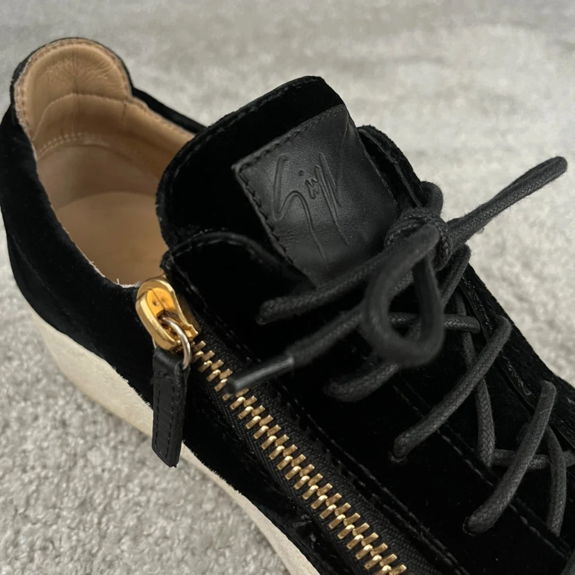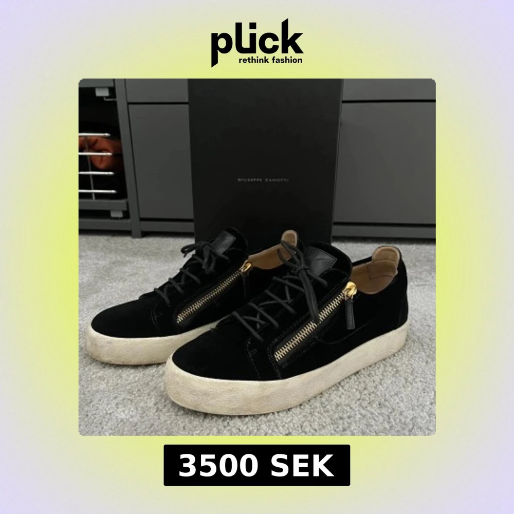 Snygga svarta sneakers i mocka från Giuseppe Zanotti med guldfärgade dragkedjor på sidorna. Skorna har en vit sula och snörning framtill. Perfekta för en stilren look. Ett litet märke framtill!