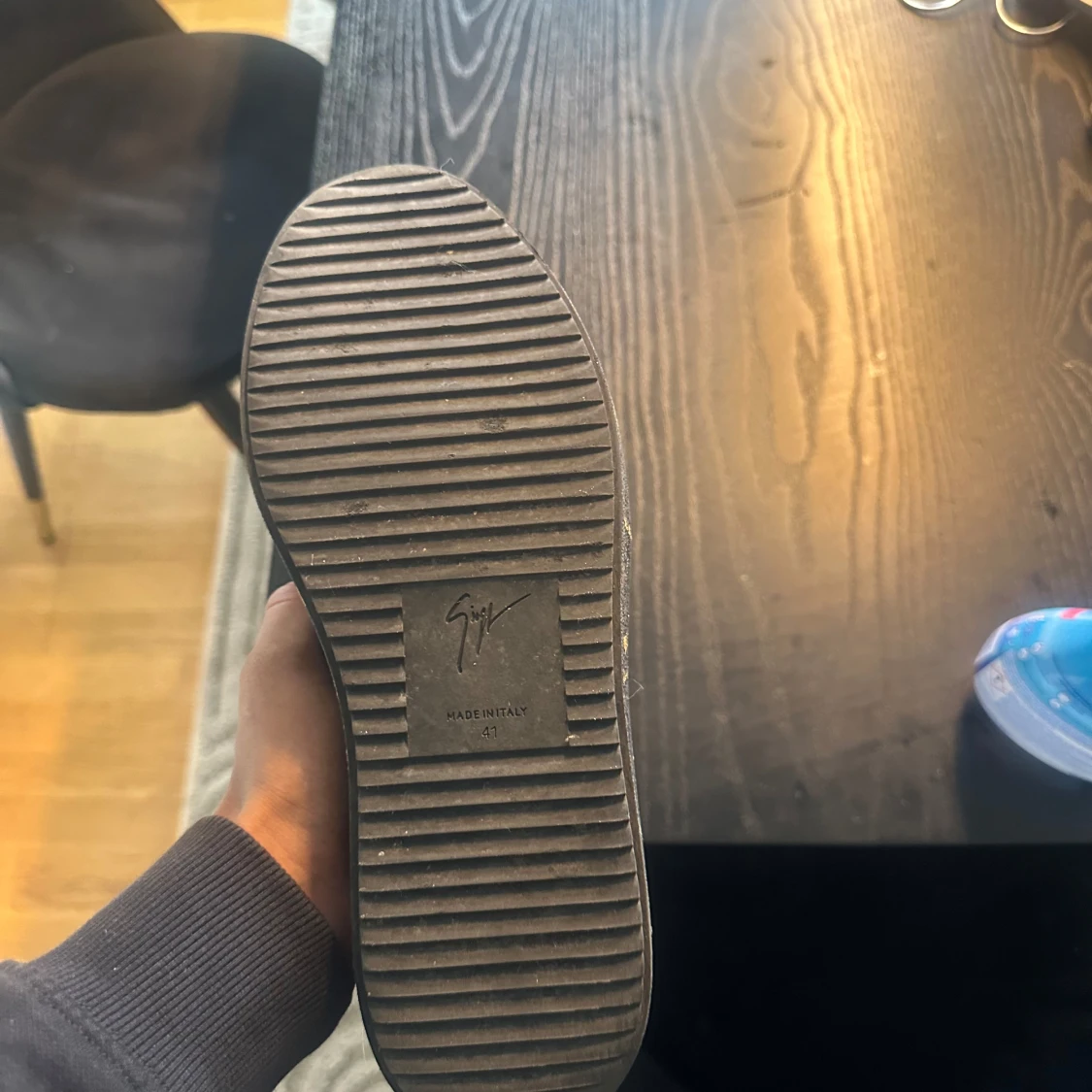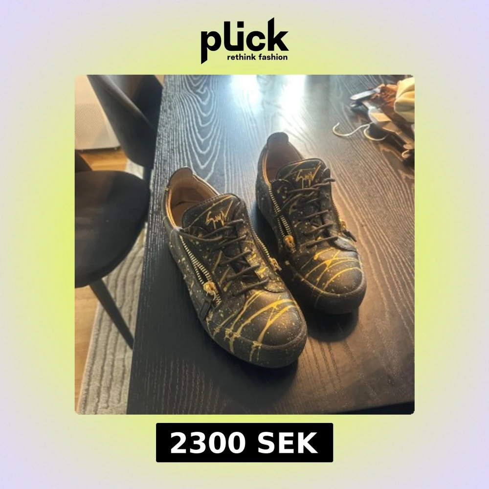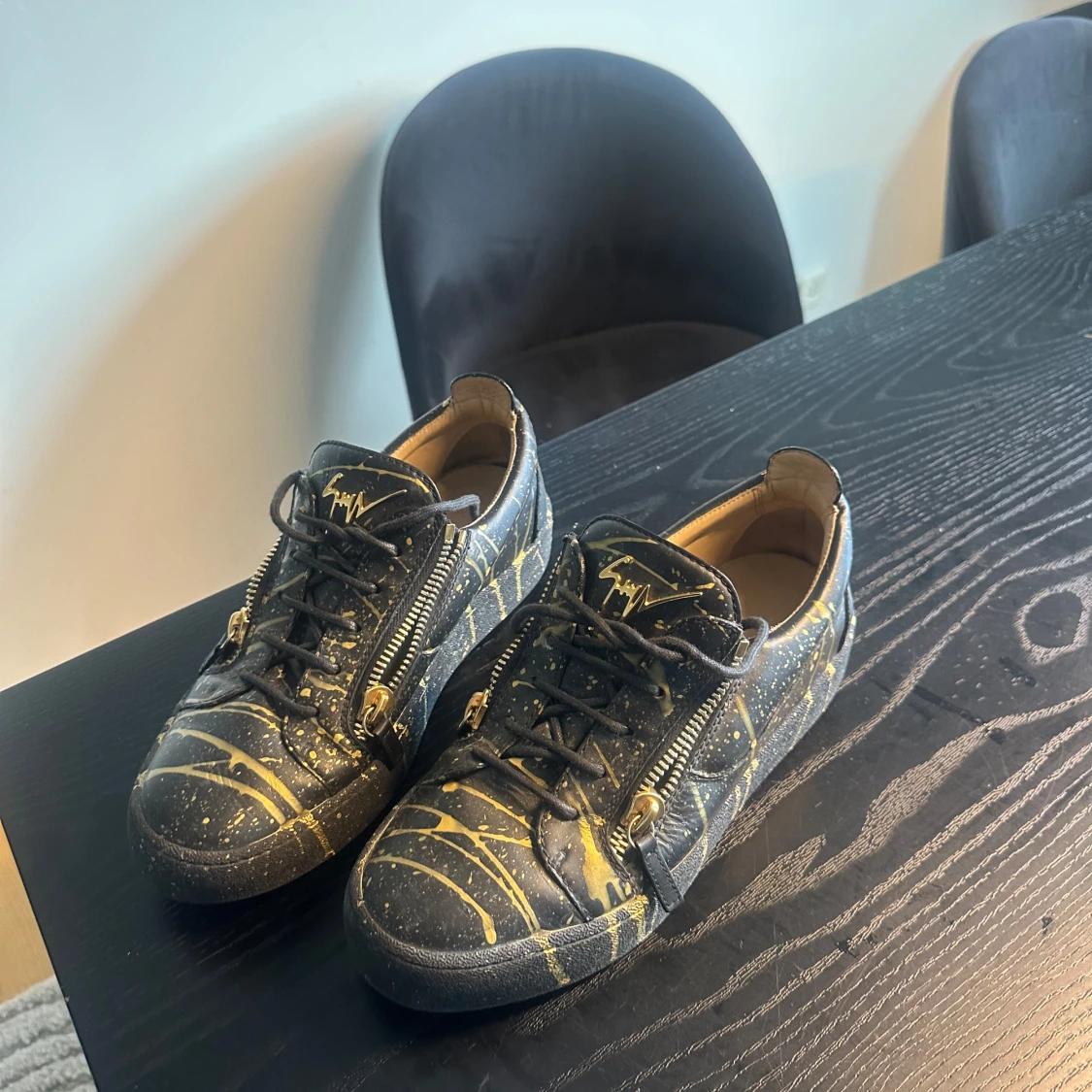 Unika äkta svarta sneakers från Giuseppe Zanotti med guldiga stänk och detaljer. Skorna har snörning, dragkedjor på sidorna och signaturlogga på plösen. Tillverkade i skinn med cool konstnärlig vibe och platt sula. Perfekta för dig som vill sticka ut.