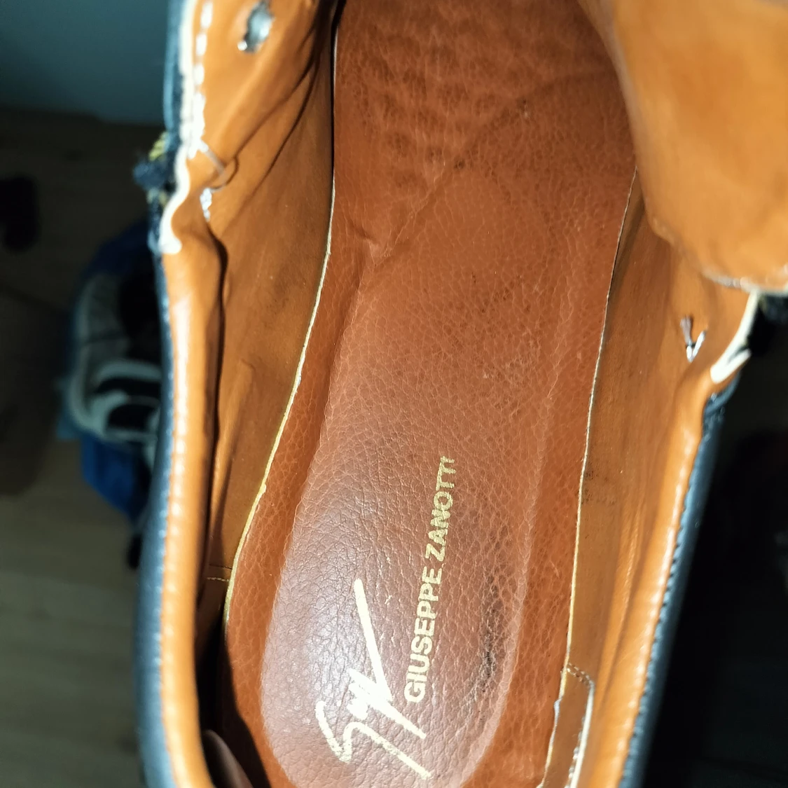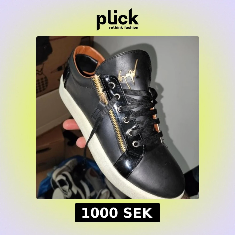Säljer ett par svarta sneakers från Giuseppe Zanotti med vita sulor, guldfärgade dragkedjor på sidorna och svart snörning. Skorna har en lyxig känsla med läderdetaljer och signatur-logga på plösen.