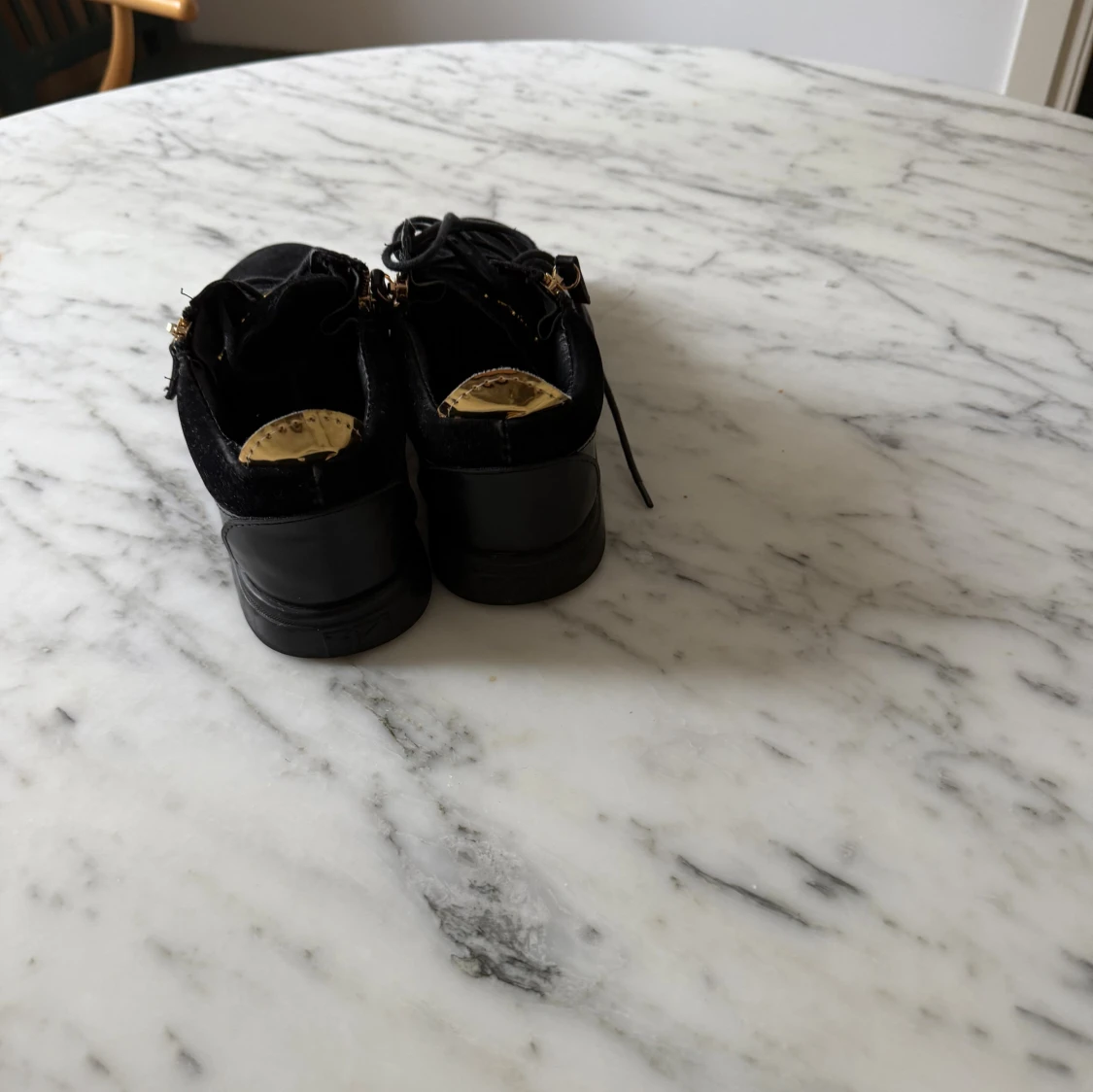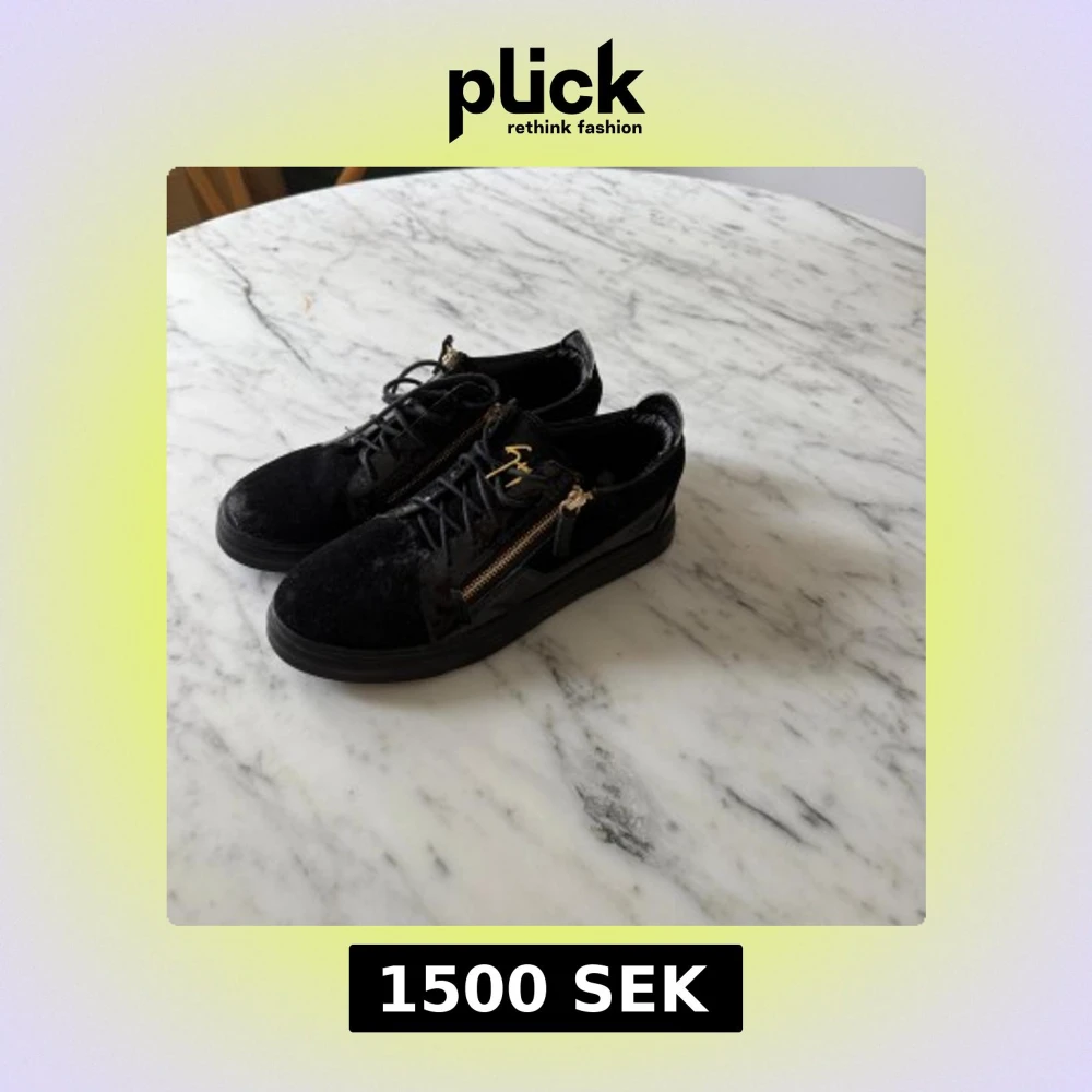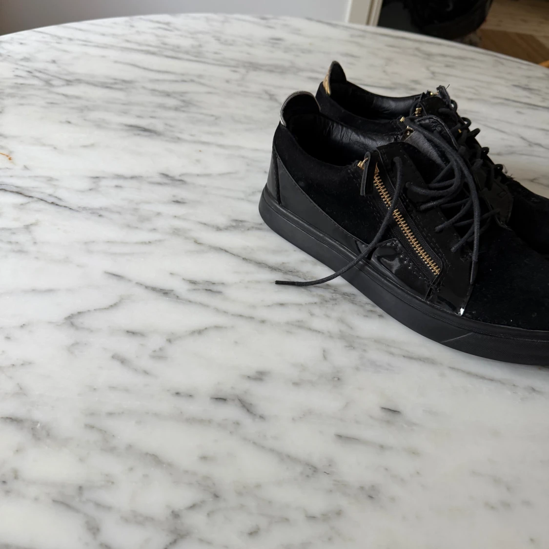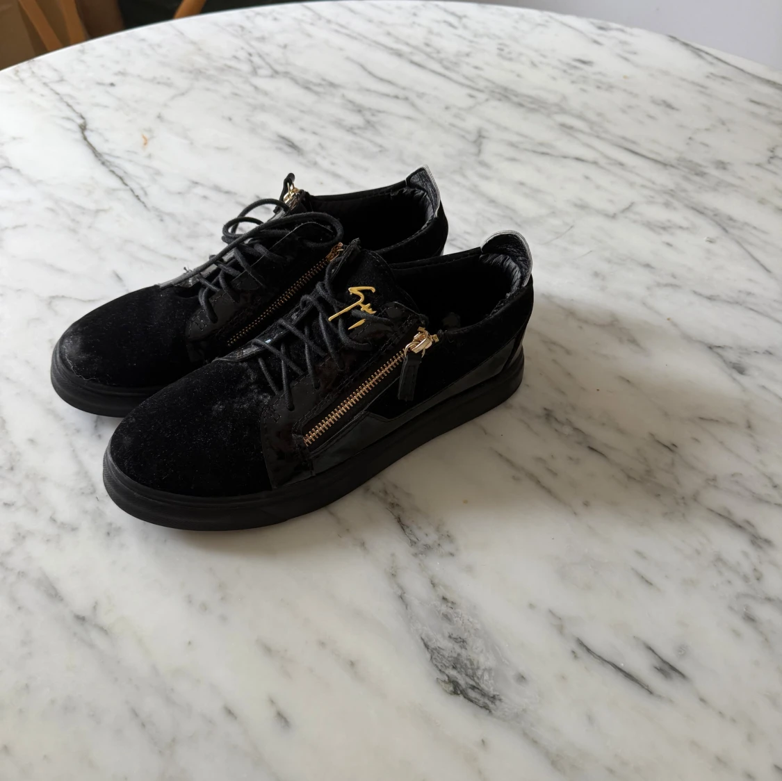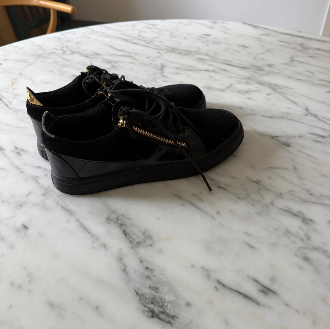 Snygga svarta sneakers från Giuseppe Zanotti med lyxiga guldfärgade dragkedjor och logga på plösen. Skorna har en mix av mocka och skinn, snörning och platt sula. Perfekt för dig som gillar exklusiv streetstyle med detaljer som sticker ut.