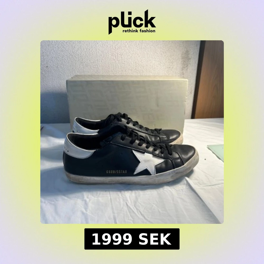 Säljer ett par svarta Golden Goose sneakers med vit stjärndetalj på sidan och vit häl. Skorna har snörning och en något smutsad platt sula för den klassiska GGDB-looken. Perfekta för dig som gillar streetstyle. Skicka 8/10