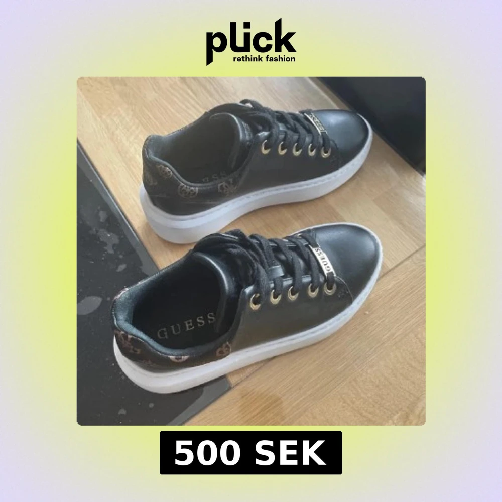 Snygga svarta sneakers från Guess med vita platta sulor och guldfärgade detaljer. Skorna har snörning och Guess-logga framtill samt mönstrad kant med logotyp runt hälen. Perfekta för dig som gillar stilrena men ändå trendiga skor.