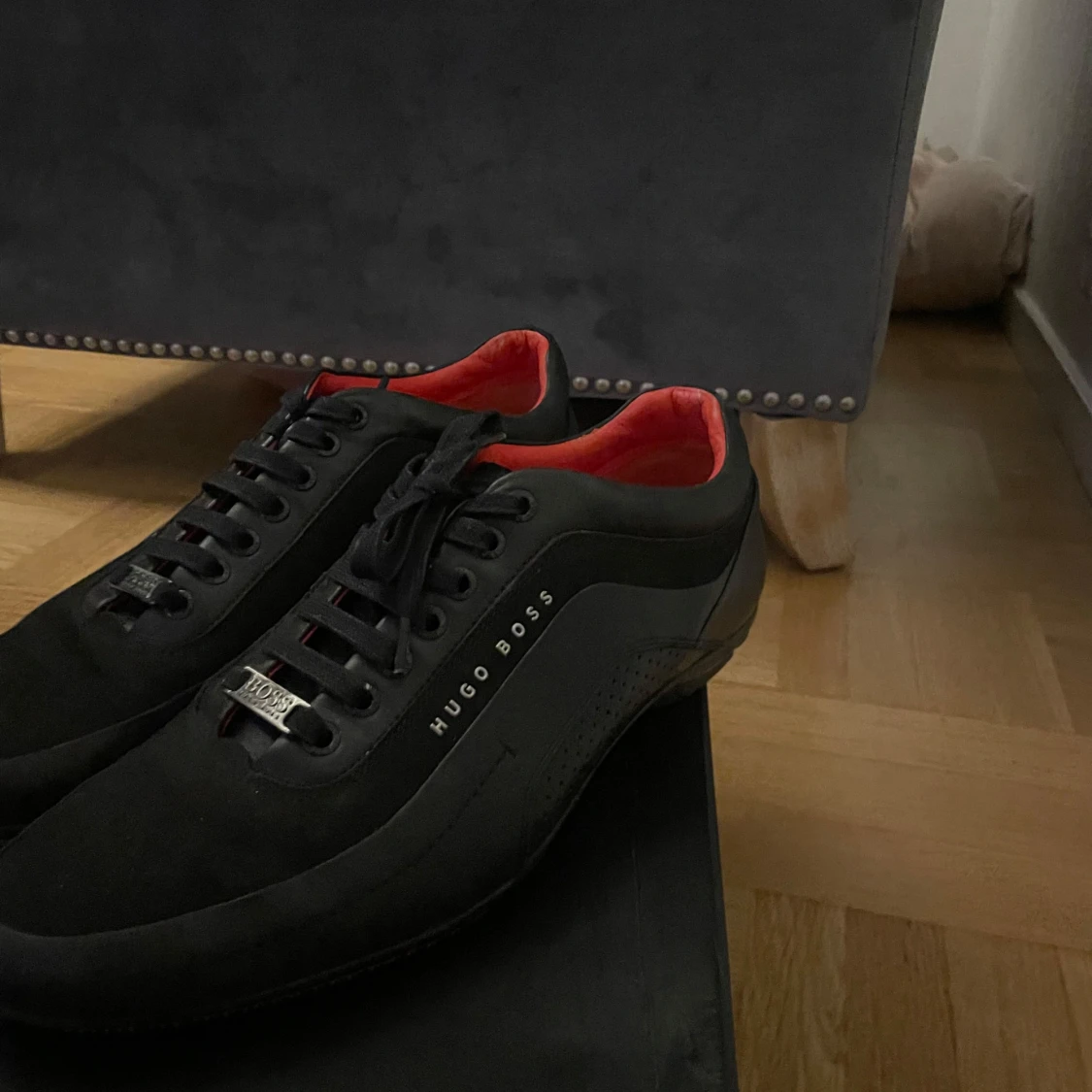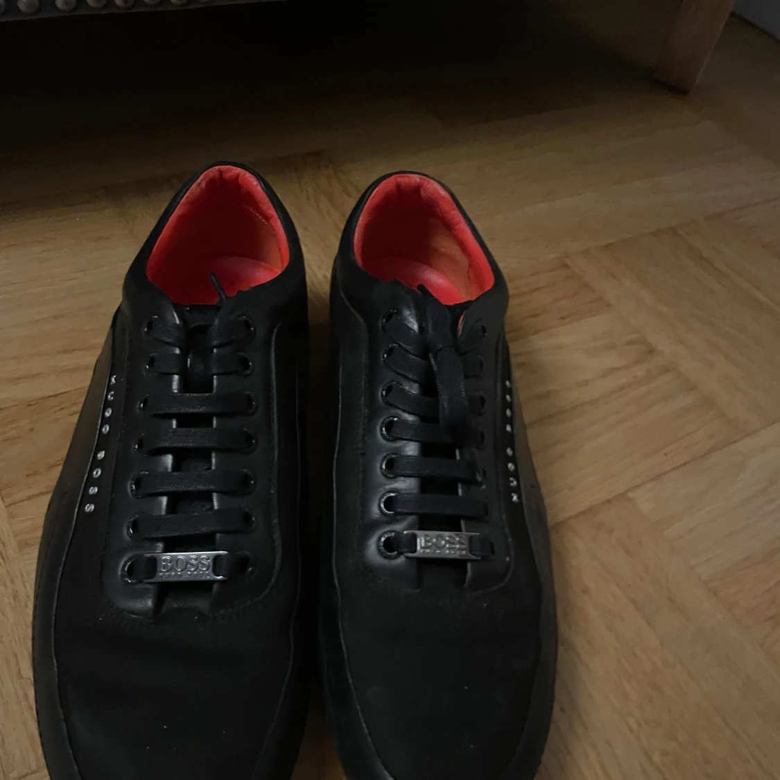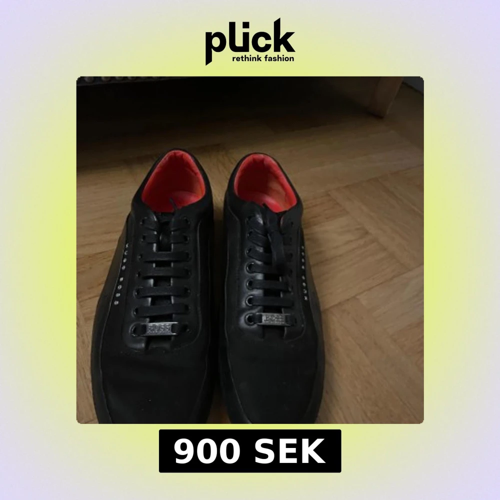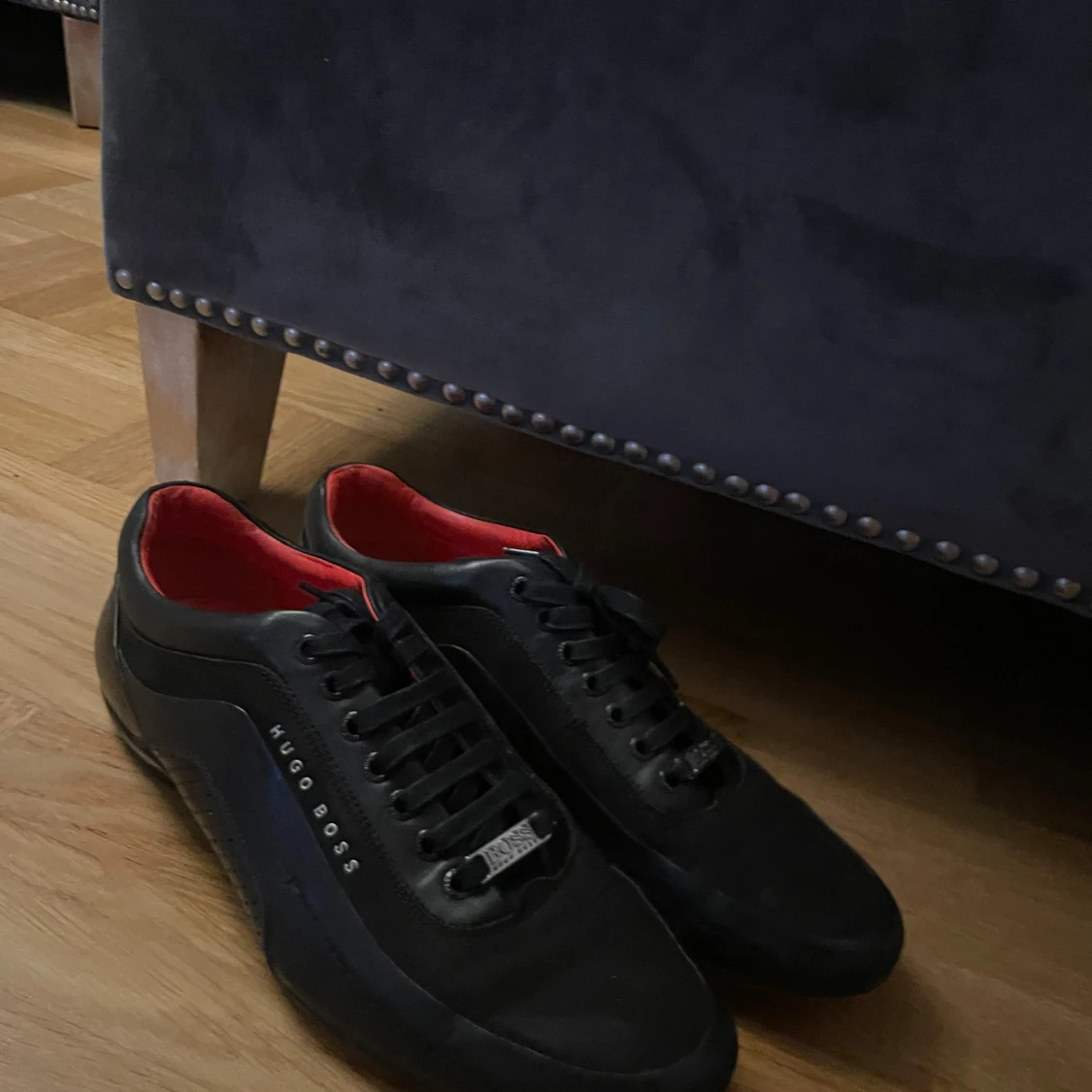 Stilrena svarta sneakers från Hugo Boss med snygga detaljer i metall och logga på sidan. Skorna har svarta snören och en cool röd insida som ger en schysst kontrast. Ovandelen är i skinn och syntet, perfekt för dig som gillar en clean och modern look.