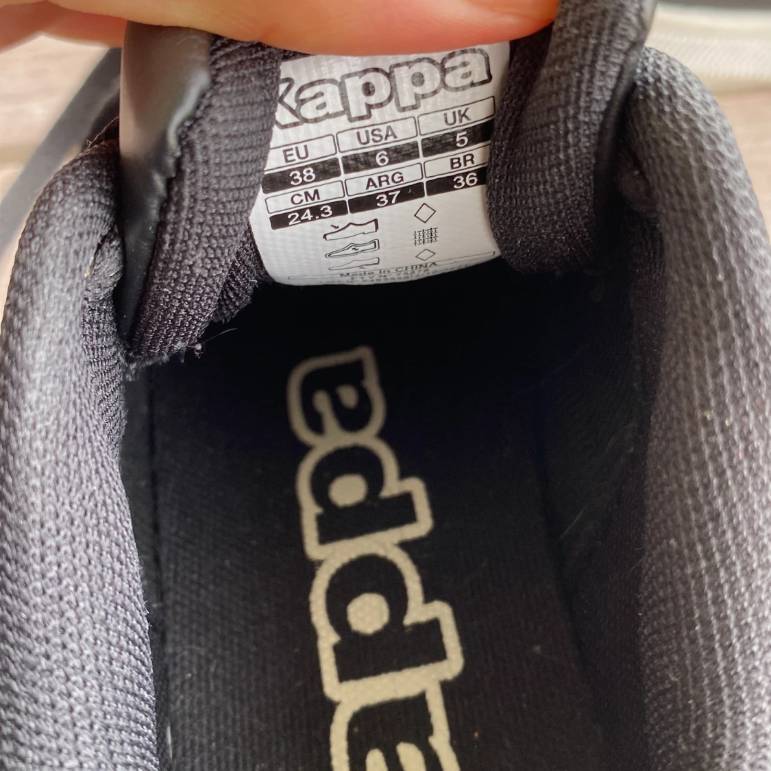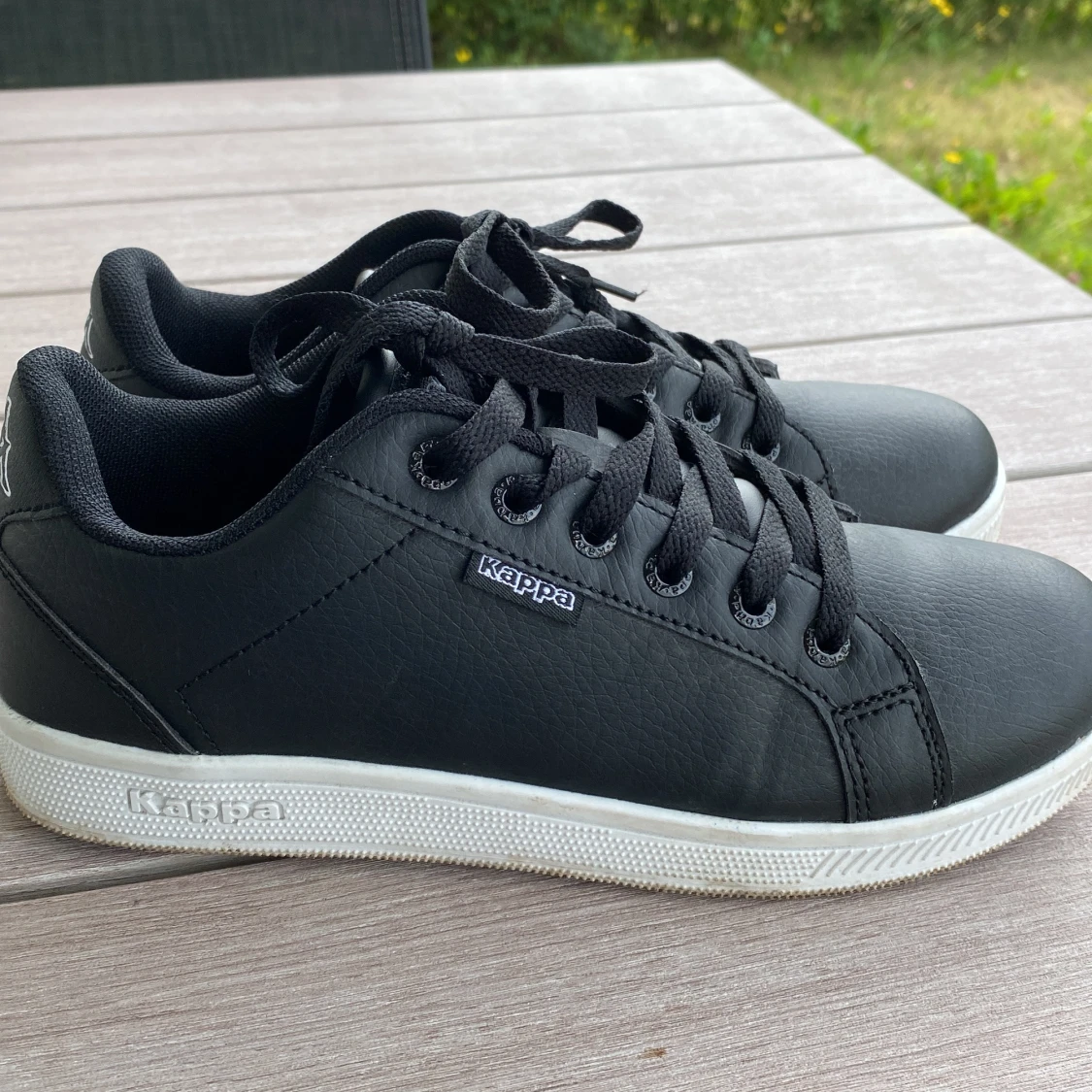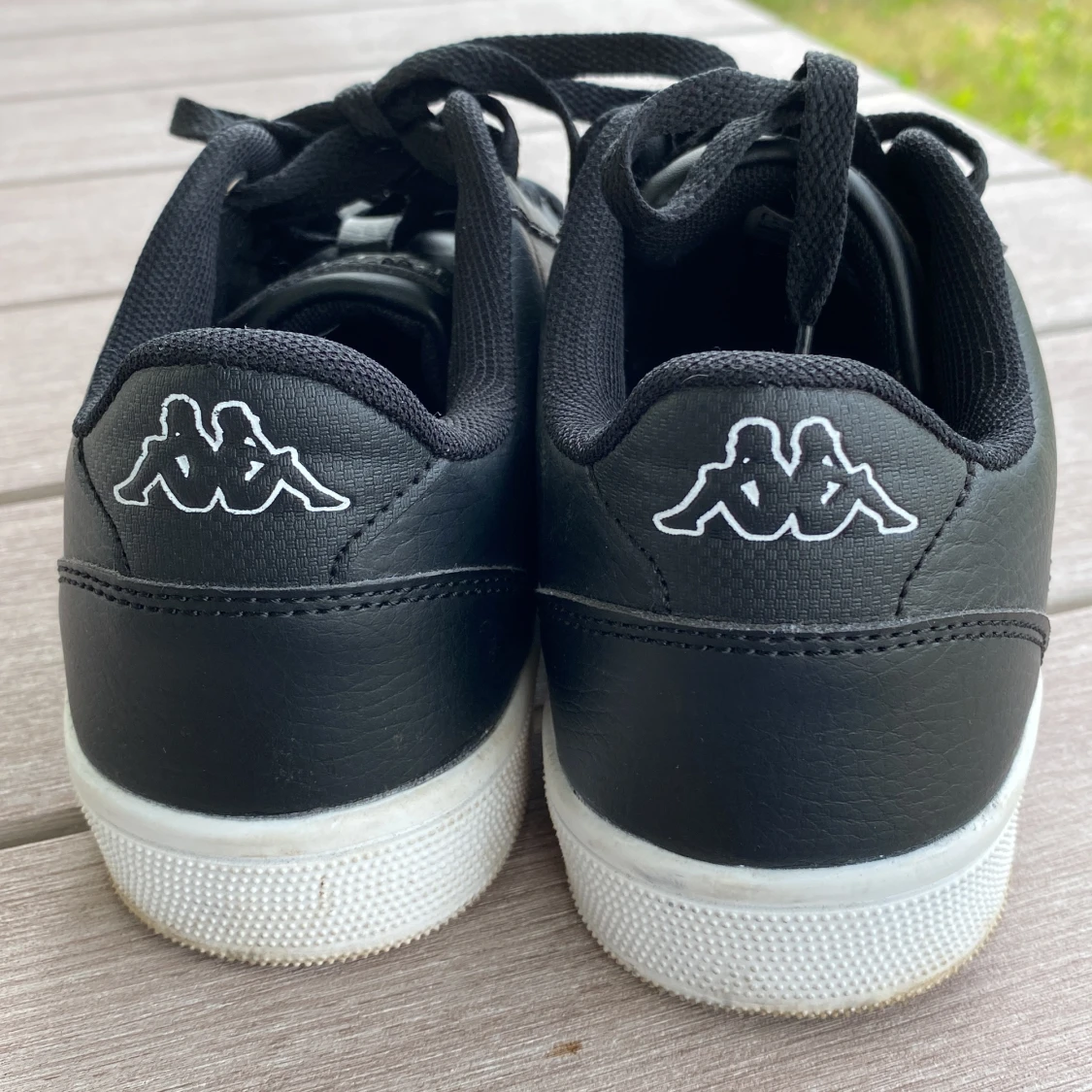 Säljer ett par stilrena svarta sneakers från Kappa i storlek 38. Skorna har en klassisk låg profil med rund tå, snörning och vit platt sula. Ovandelen är i syntetmaterial med diskret Kappa-logga på sidan och bak. Perfekta för dig som gillar enkel och clean streetstil. Nyskick. De är nog mer som storlek 37 men mått kan fås av sulan.