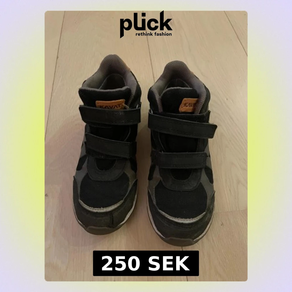 Säljer ett par svarta sneakers från Kavat med grå detaljer och bruna läderpatches. Skorna har två breda kardborreband för enkel påtagning och en platt sula. Ovandelen är i textil och syntet, med vadderad insida för extra komfort.
