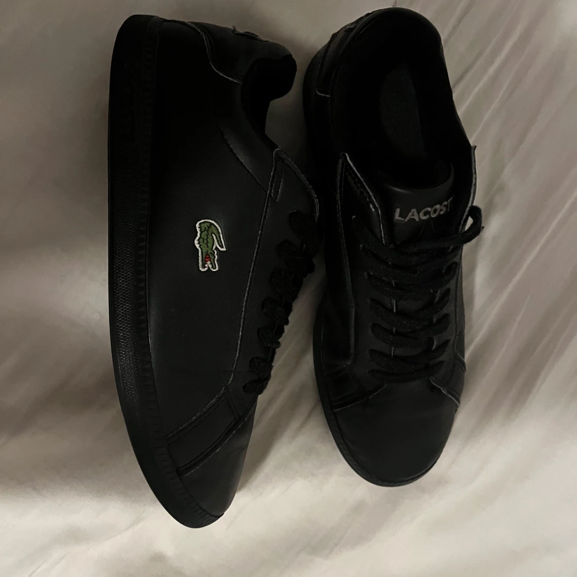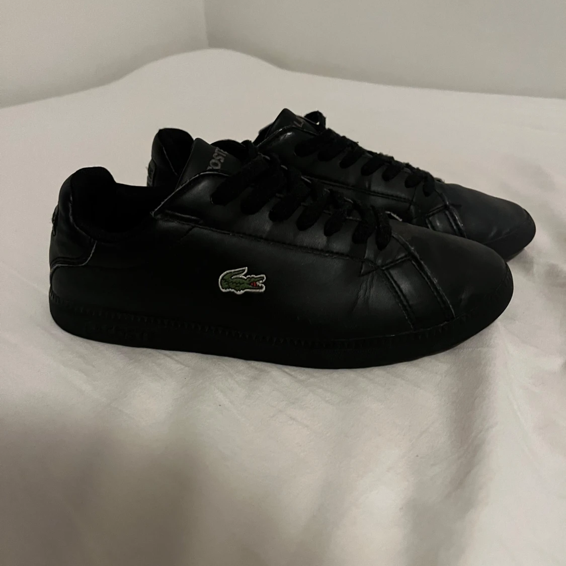 Snygga svarta sneakers från Lacoste med klassisk krokodillogga på sidan. Skorna har en stilren design med snörning och är tillverkade i skinn. Perfekta för en casual look. Perfekt skick förutom snörena lite skadade längst upp, går att fixa.