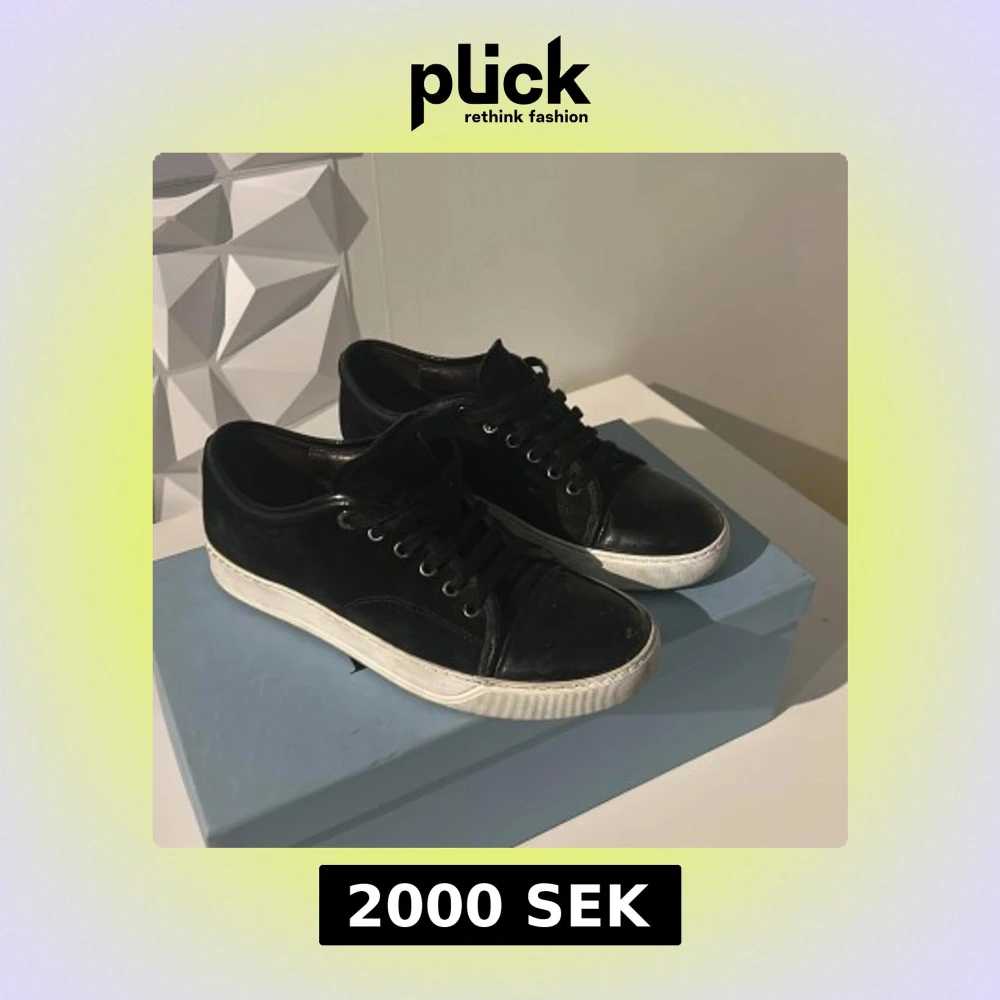 Snygga svarta sneakers från Lanvin med ovandel i mocka och detaljer i skinn. Skorna har rund och glansig tå, svarta snören och vit platt sula. Perfekta för dig som gillar stilrena och lyxiga sneakers med en clean look.