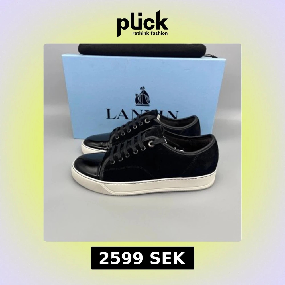 Snygga svarta sneakers från Lanvin med vit platt sula och snörning. Ovandelen är i mocka och tån är i blankt lackskinn för en extra lyxig känsla. Klassisk rund tå och diskreta detaljer som ger en stilren look. Perfekta för dig som gillar exklusiva sneakers. I storlek 43 i ny skick för 2599kr.