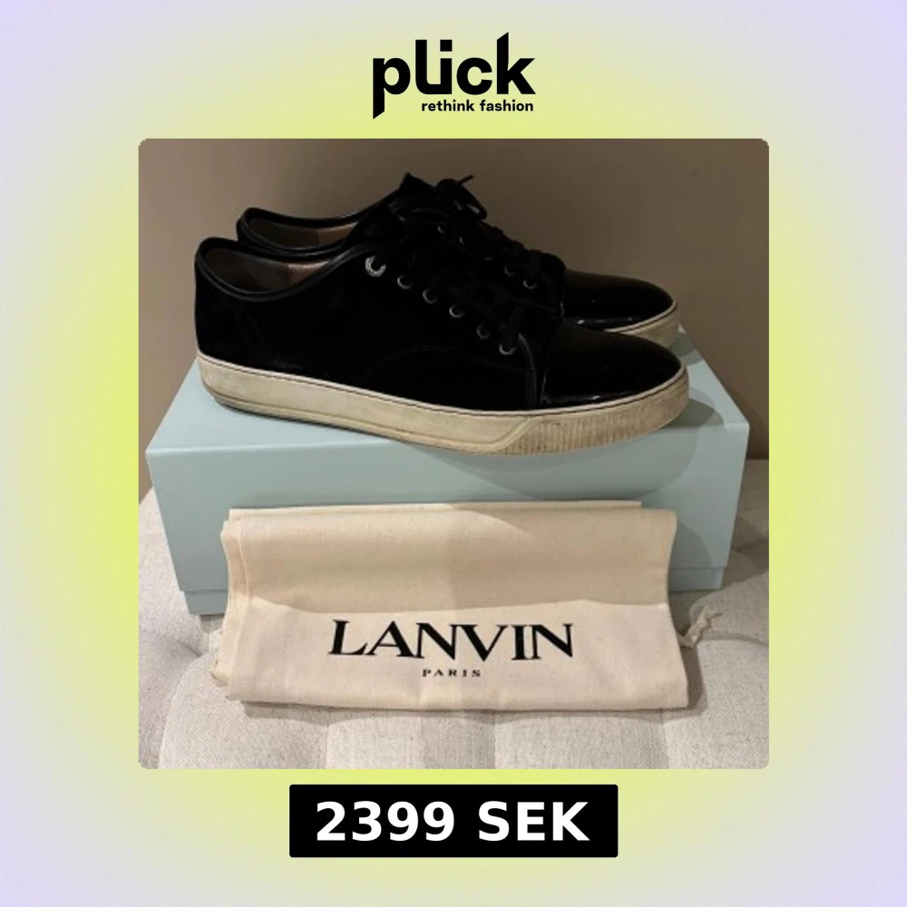 Säljer ett par svarta Lanvin sneakers i lyxig kombination av mocka och lackat kalvskinn. Klassisk låg modell med rund tå, svarta snören och vit gummisula. Kommer med originalbox och dustbag. Perfekta för dig som gillar stilrena och exklusiva sneakers.