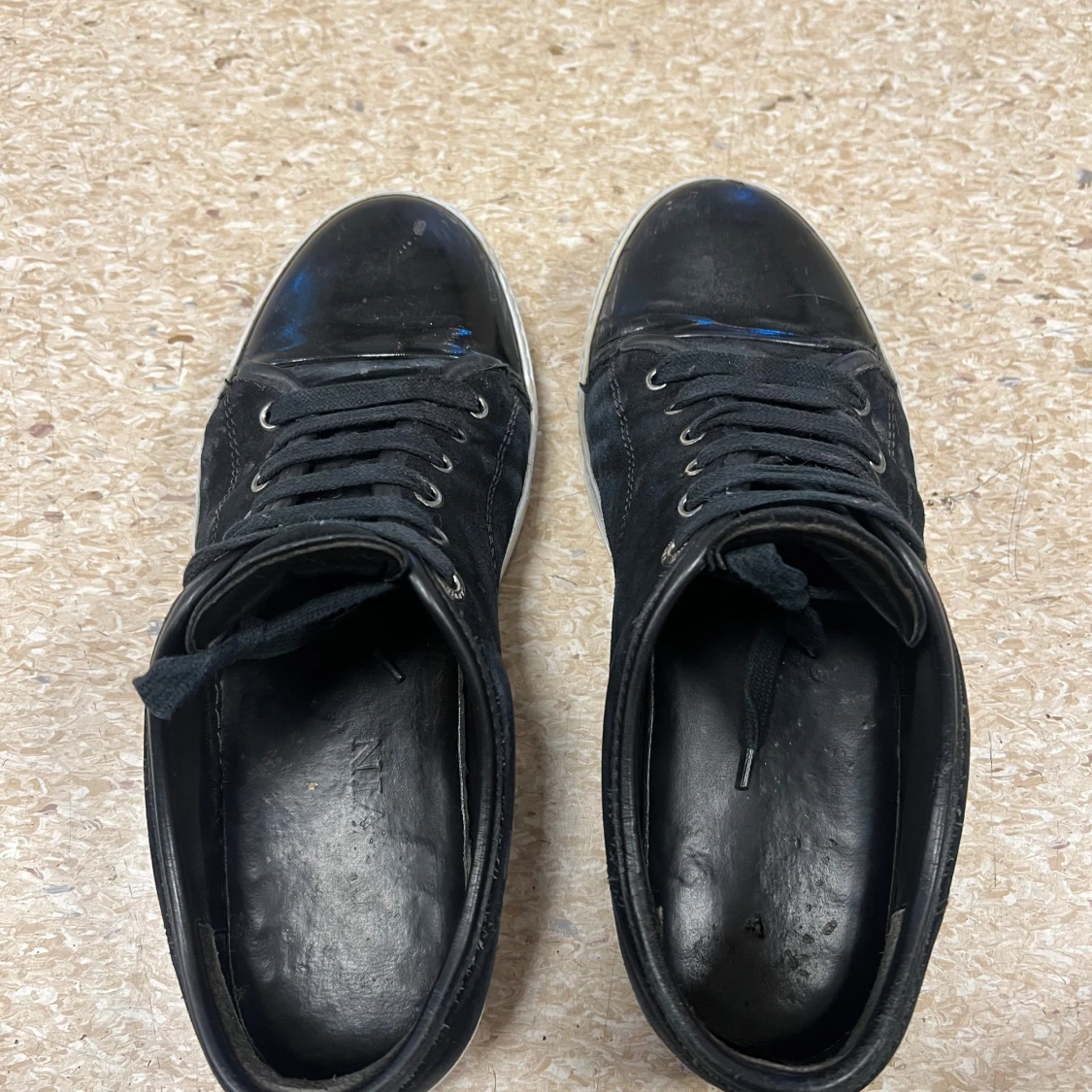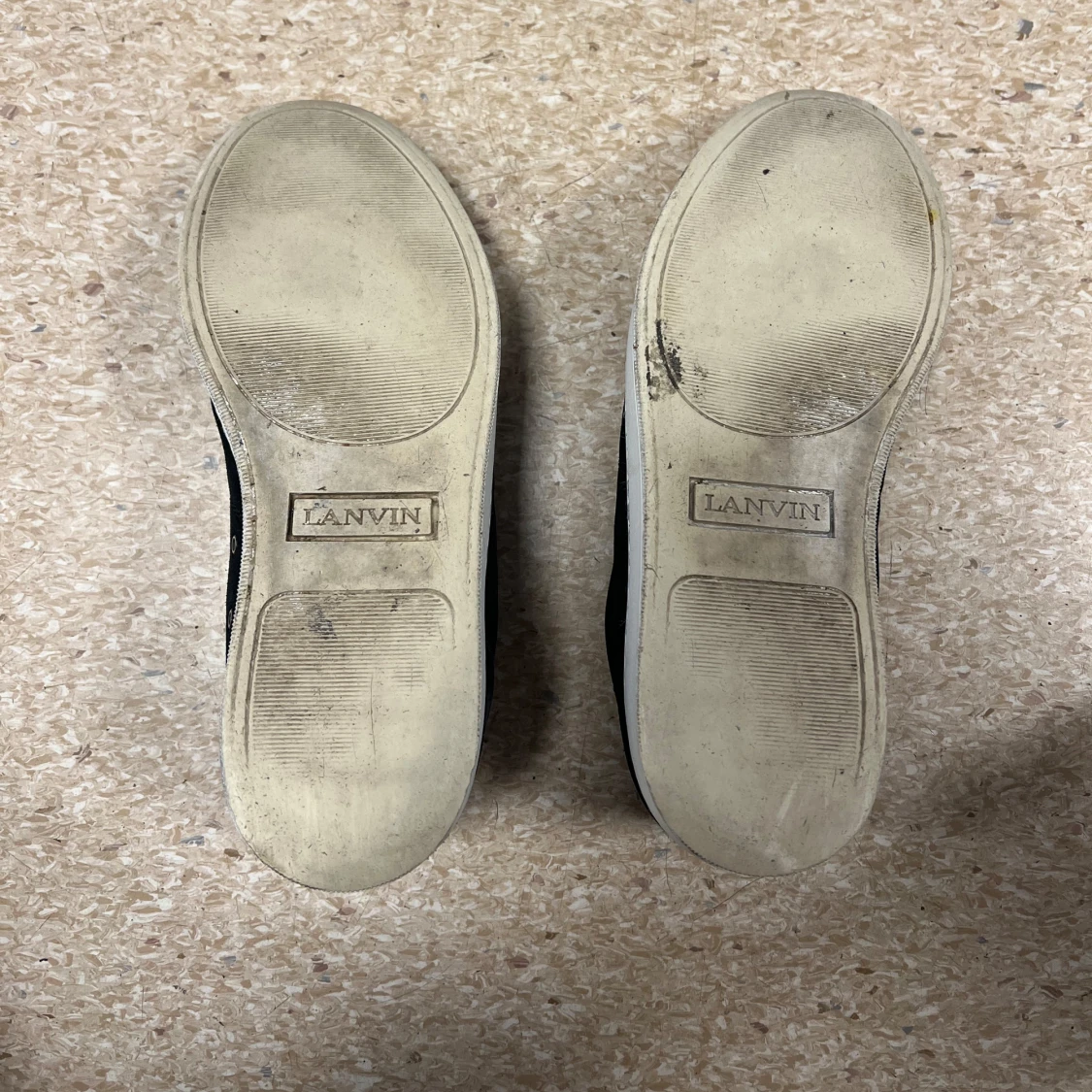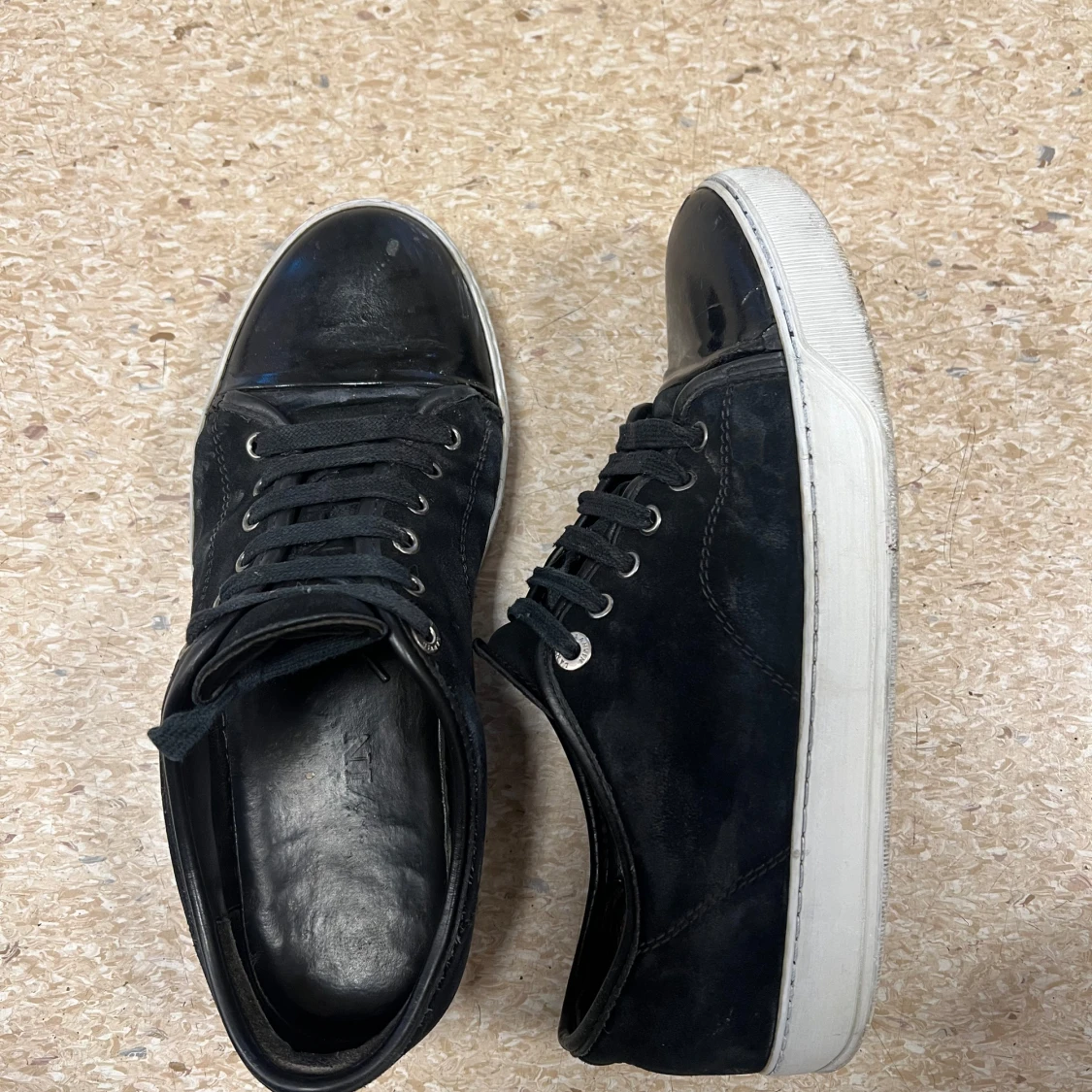 Snygga svarta sneakers från Lanvin med ovandel i mocka och detaljer i blankt skinn på tån. Skorna har vita gummisulor och klassisk snörning med metallöljetter. Perfekta för dig som gillar stilrena och exklusiva sneakers med en lyxig känsla.