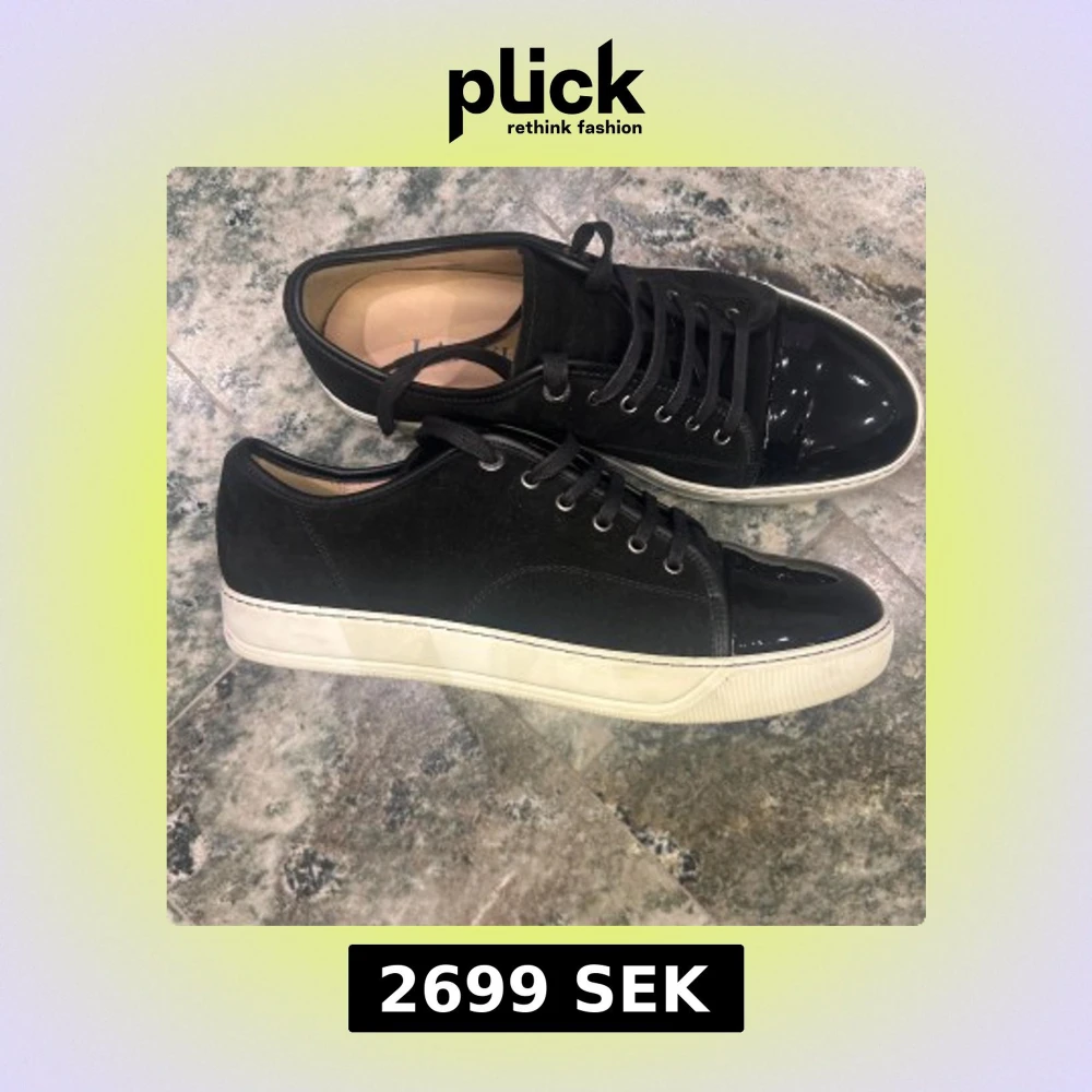 Säljer ett par svarta sneakers från Lanvin med snygg lackad tå och vit platt sula. Skorna har snörning och en stilren design med både mocka och glansigt material framtill. Perfekta för dig som gillar en clean och modern look. Storlek uk10/44 och Dustbags ingår