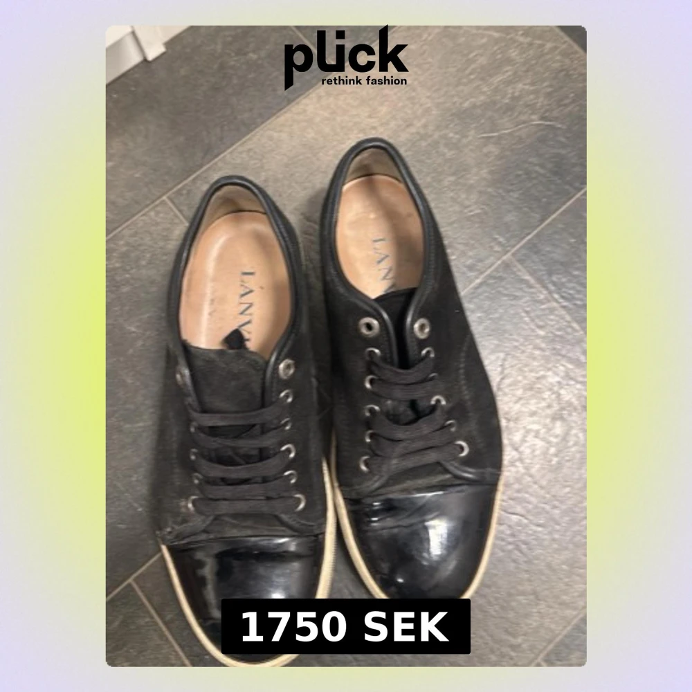 Svarta sneakers från Lanvin med snygg kontrast mellan mocka och blank lackad tå. Skorna har rund tå, snörning och vit sula. Klassisk och stilren design med exklusiv känsla, perfekt för dig som gillar lyxiga detaljer och streetstyle. Box och pris lapp finns det är bara skriv vid fundering!