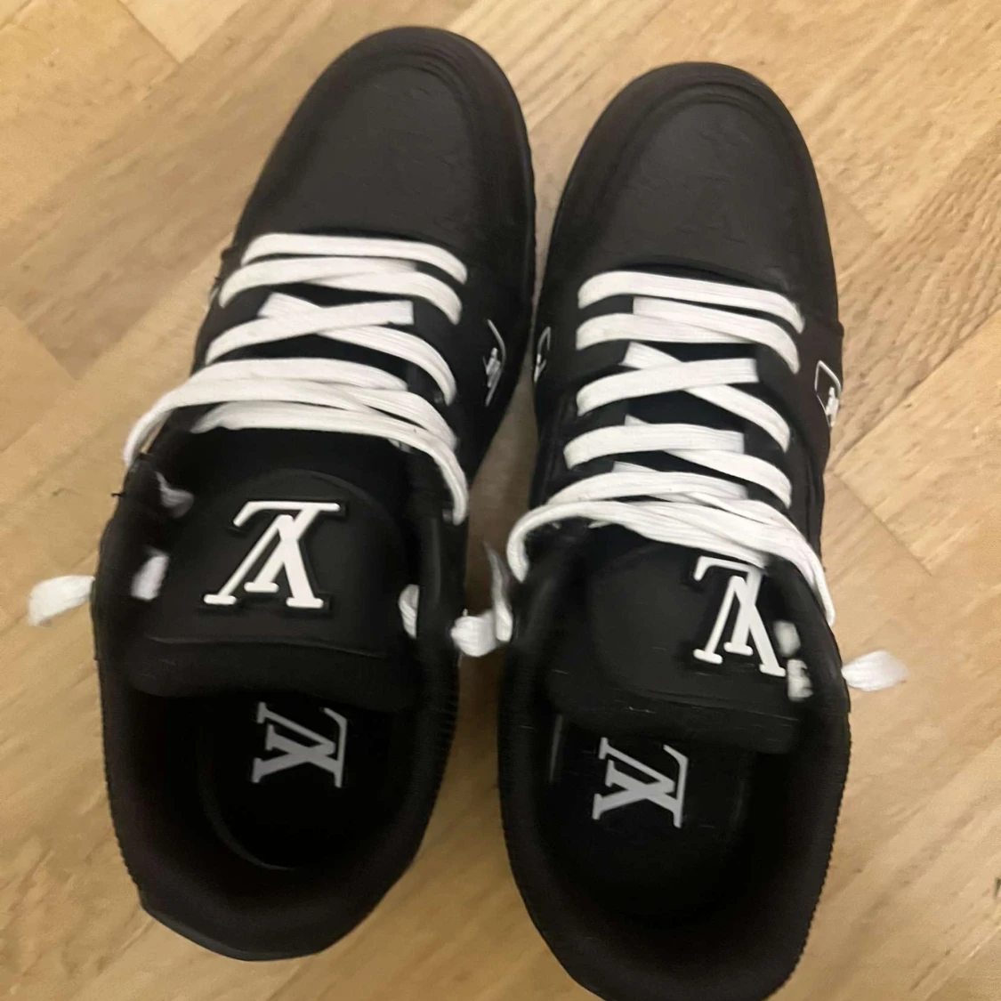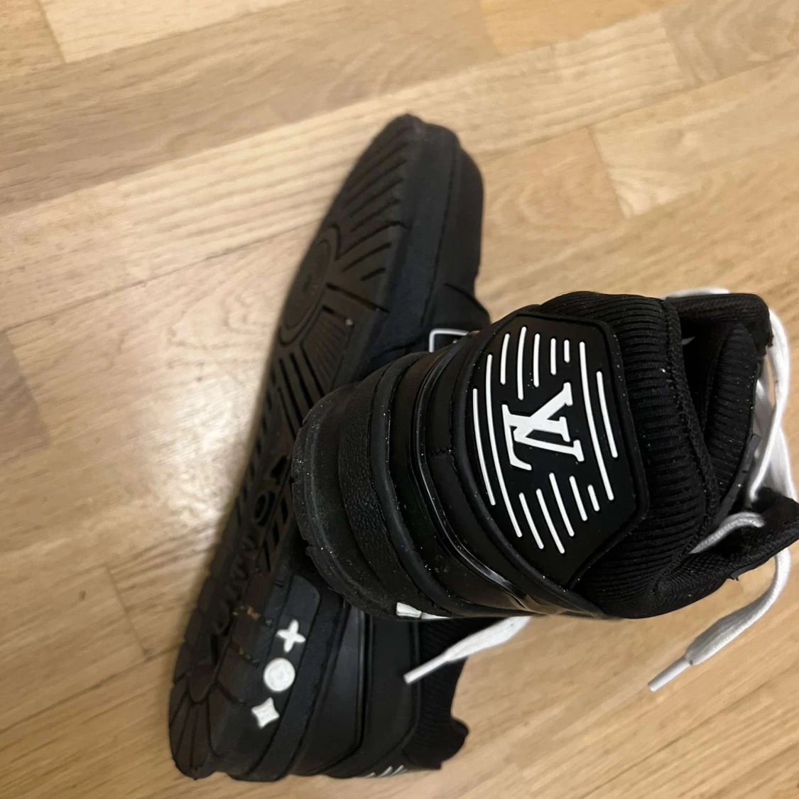Snygga svarta sneakers från Louis Vuitton med vita snören och tydlig LV-logga. Skorna har en präglad design på ovansidan och en robust sula med VUITTON-text. Perfekta för en stilren look.