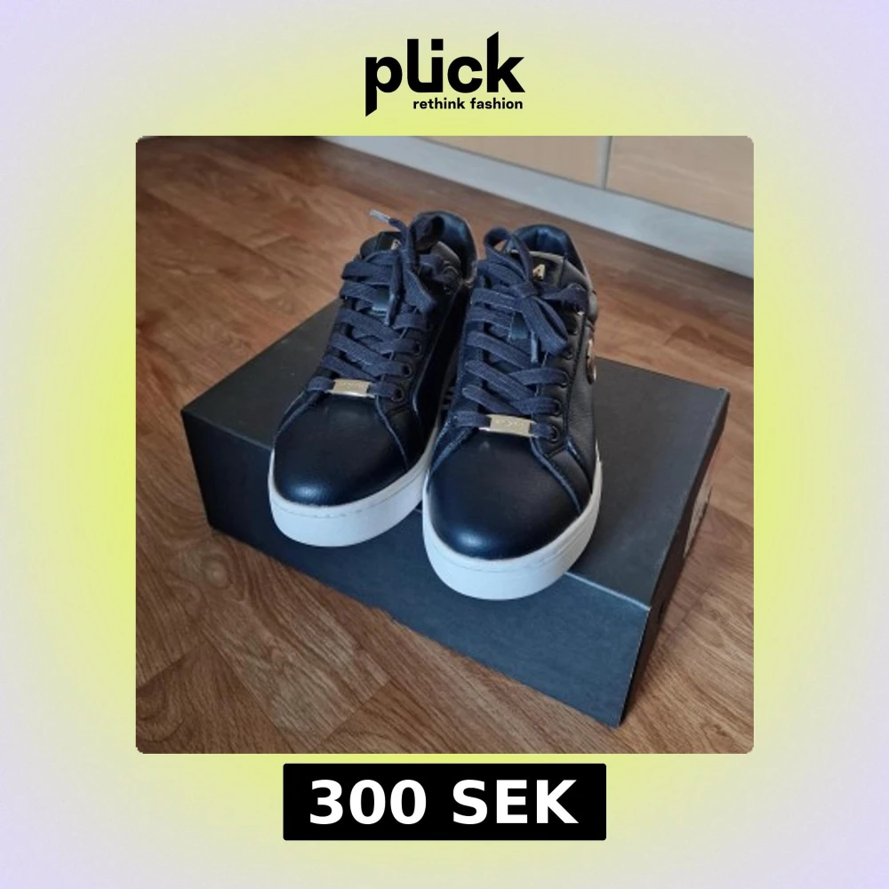 Snygga svarta sneakers från Mexx med vita platta sulor och gulddetaljer på snörningen och sidan. Skorna är i skinnimitation med blank häl och rund tå. Perfekta för dig som vill ha en stilren och trendig look. Använda 1 gång, liten i storlek.