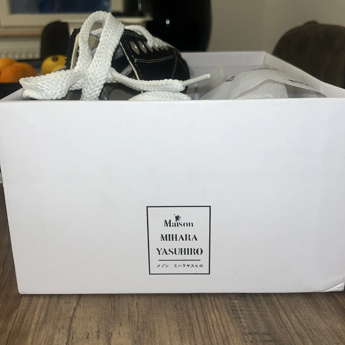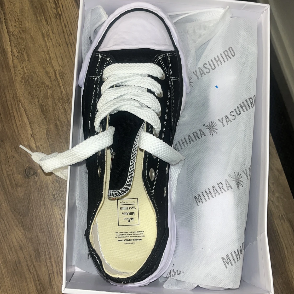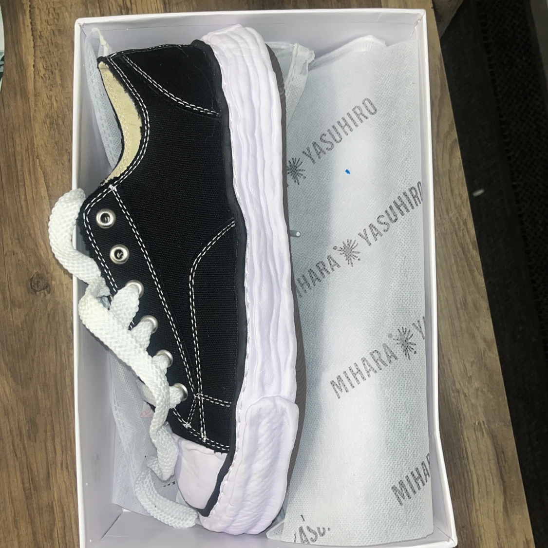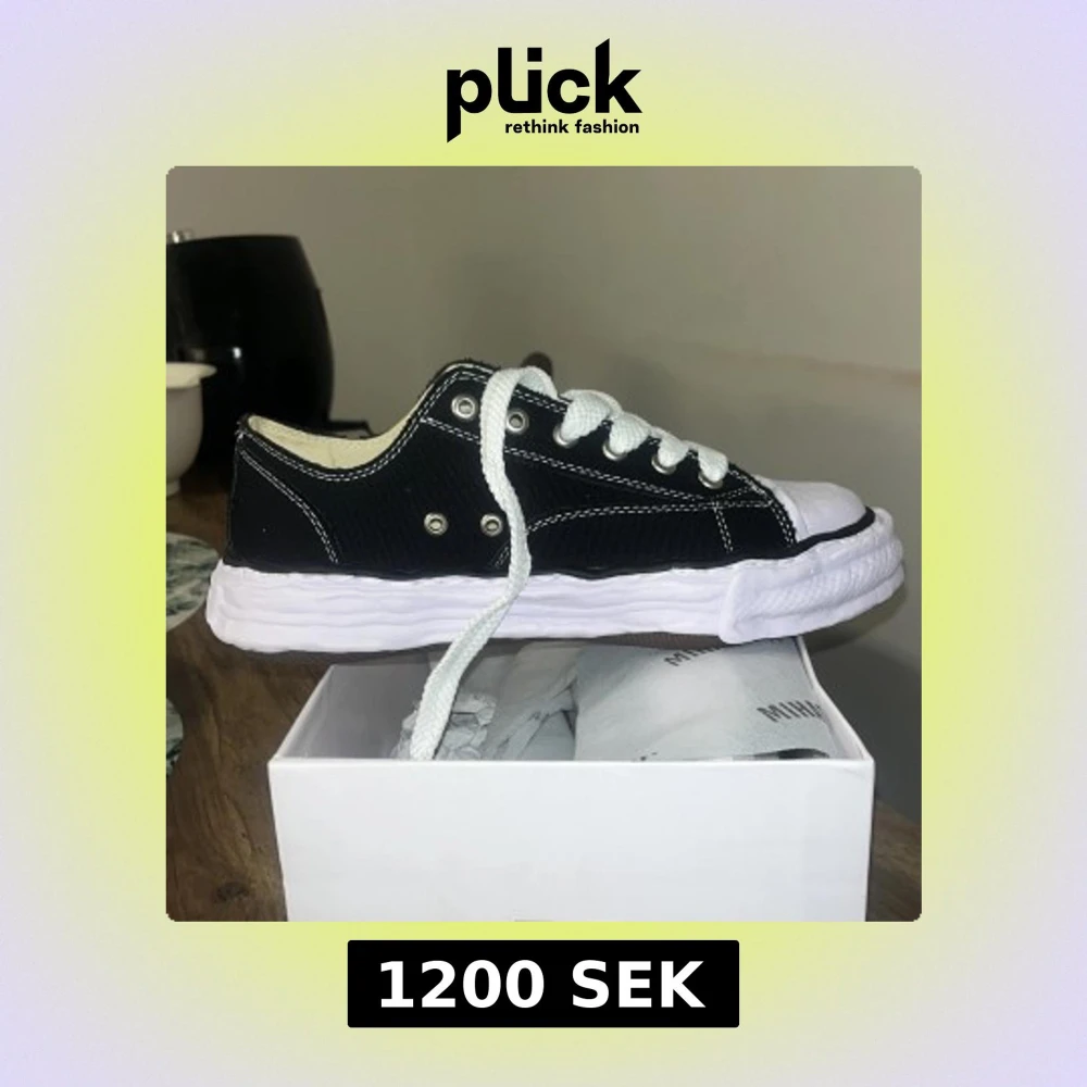 Säljer ett par svarta Mihara Yasuhiro sneakers med vit, vågig sula och vita snören. Skorna har tydliga kontrastsömmar och en unik, chunky design. Perfekta för dig som vill sticka ut med din stil.