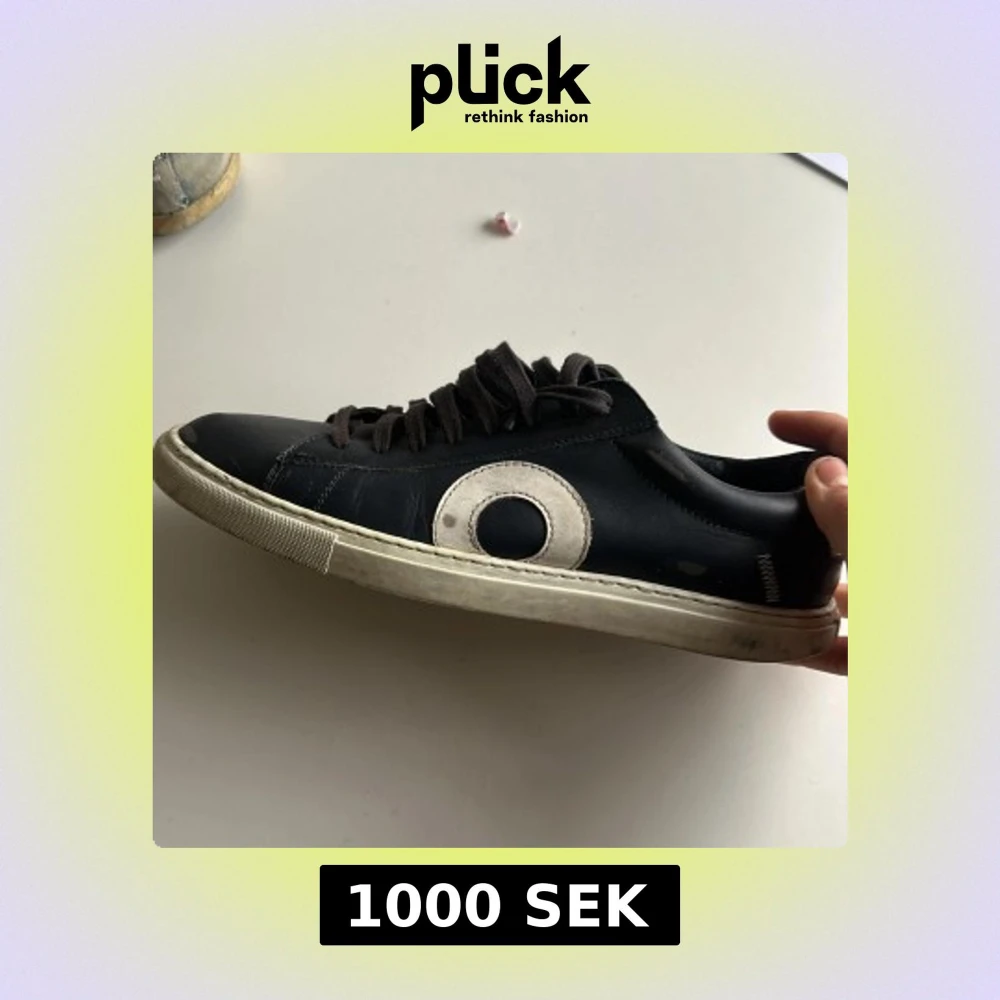 Snygga svarta sneakers från Oliver Cabell med vit rund detalj på sidan och vit häl. Skorna har platt sula, rund tå och svarta snören. Den ena har inga sko snören för att dom gick sönder så man får själv lösa nya till dom.