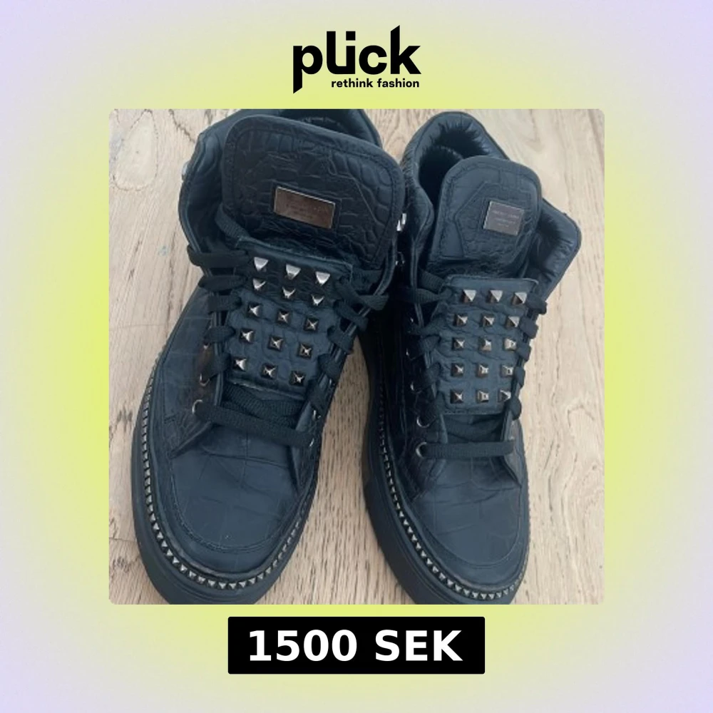 Snygga svarta sneakers från Philipp Plein med krokodilpräglat mönster och coola nitar på ovansidan. Skorna har snörning och är tillverkade i Italien. Perfekta för dig som vill ha en unik stil. PRISET KAN ALLTID DISKUTERAS