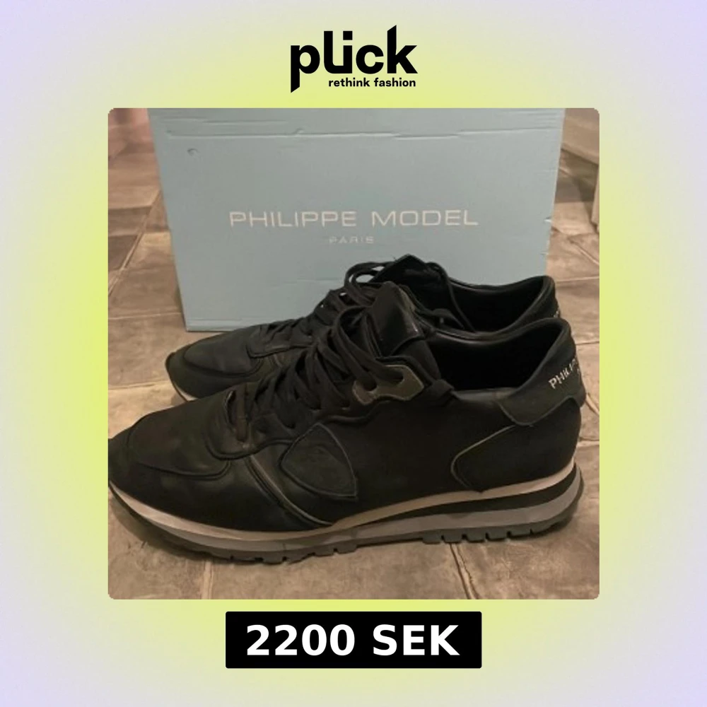 Säljer ett par svarta Philippe Model sneakers med snörning och rund tå. Skorna har en platt sula med grå detalj och är tillverkade i skinn och syntet. Märkeslogga broderad på hälen. Perfekta för en stilren look. Pris går att diskuteras vid snabb affär ny pris (4500kr)