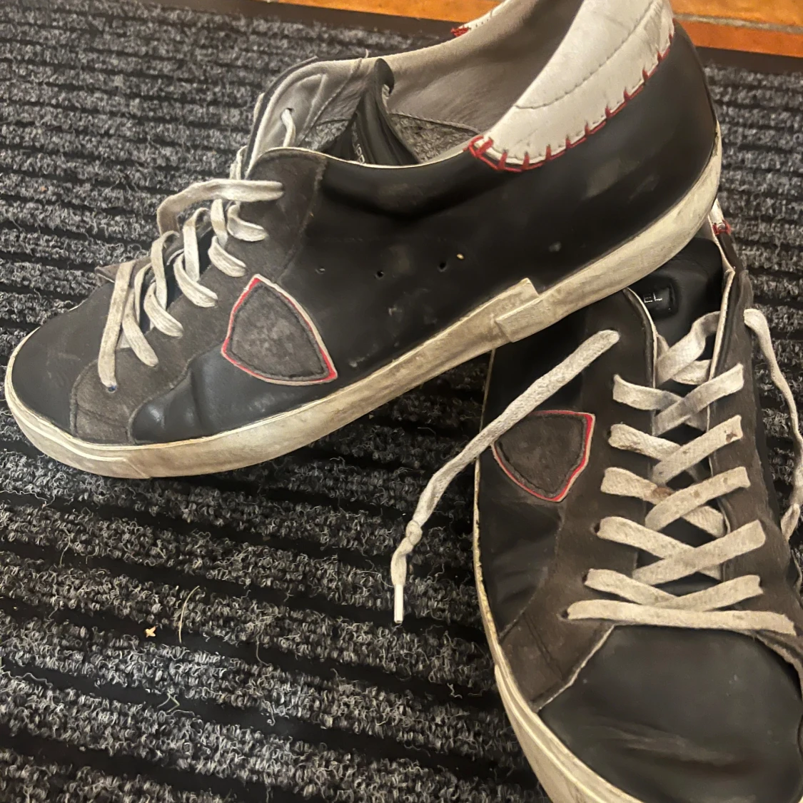Svarta sneakers från Philippe Model med vita snören och vit sula. Skorna har detaljer i mocka och skinn, samt en vit hälkappa med röd söm. Sidan pryds av en sköldformad patch med röd kant. Perfekta för en avslappnad streetstil.