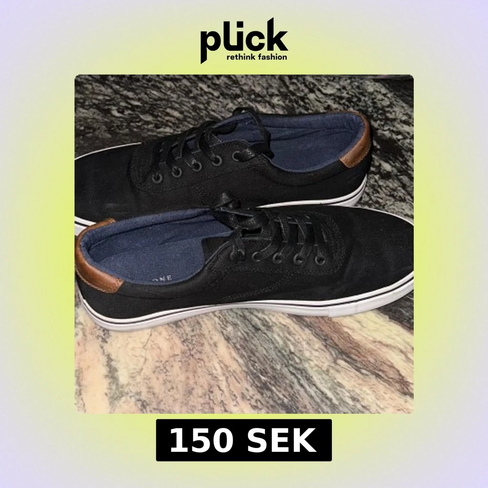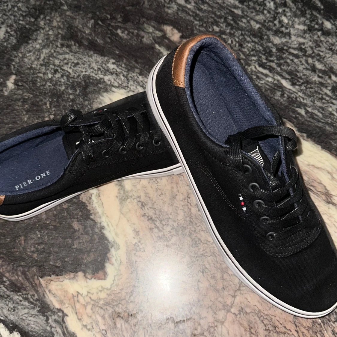 Svarta sneakers från Pier One i canvas med vita sulor och bruna detaljer vid hälen. Skorna har klassisk snörning och en låg profil, perfekt för en clean och stilren look. Mörkblå insida och diskret logga på sidan.