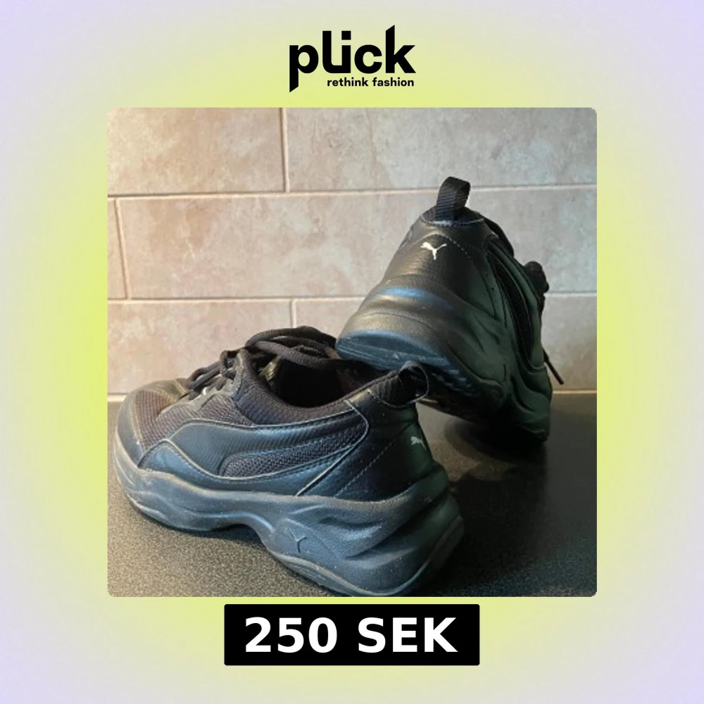 Säljer ett par svarta sneakers från Puma med tjock sula och klassisk logga på hälen. Skorna har snörning och är tillverkade i en kombination av syntet och textil. Perfekta för vardagsbruk och har en sportig look.