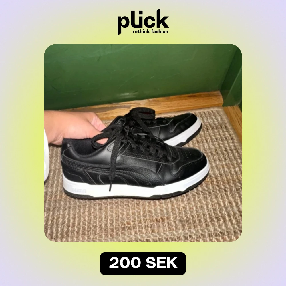 Säljer ett par snygga svarta sneakers från Puma i storlek 39. Skorna är i skinn med en vit sula och har klassisk snörning. Perfekta för både vardag och träning. De är i nytt skick och redo för en ny ägare!