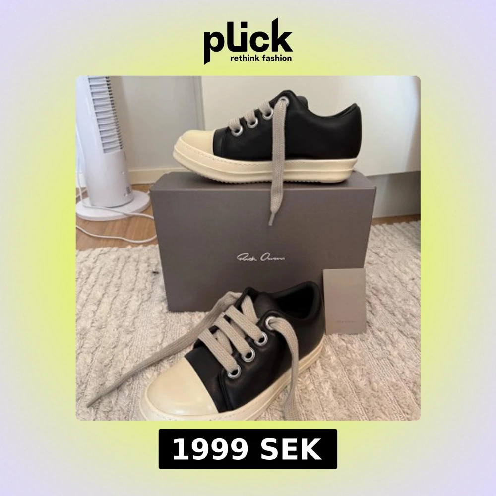 Säljer ett par svarta sneakers från Rick Owens med vit sula och tå. Skorna har breda grå snören och en chunky platt sula. Klassisk design med rund tå och kontrasterande detaljer. Perfekta för dig som gillar stilrena och trendiga skor.