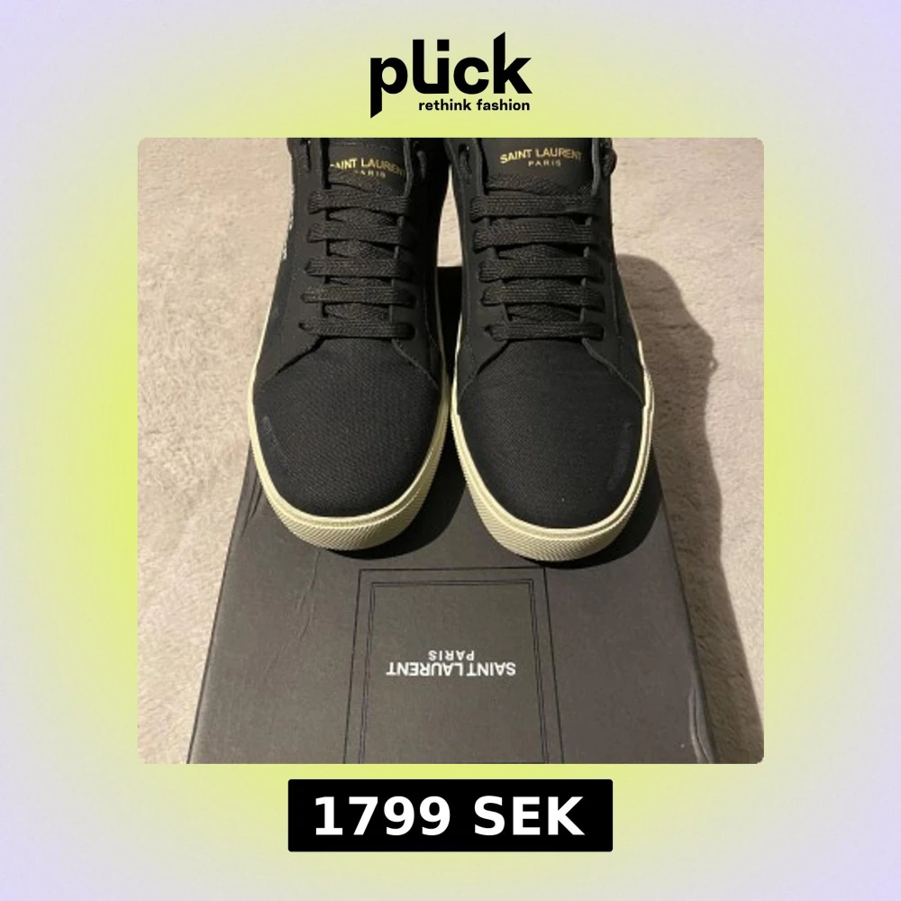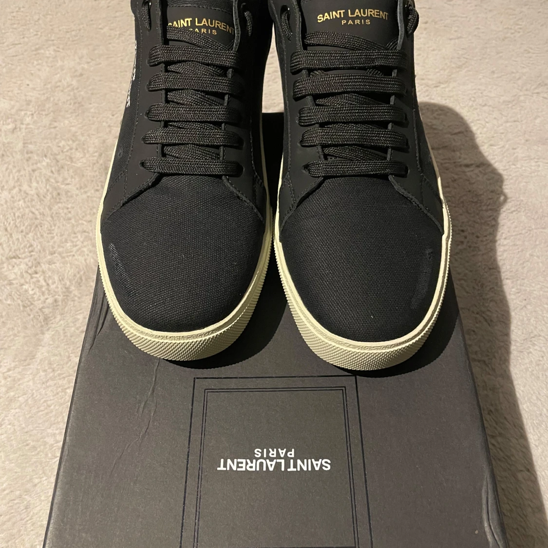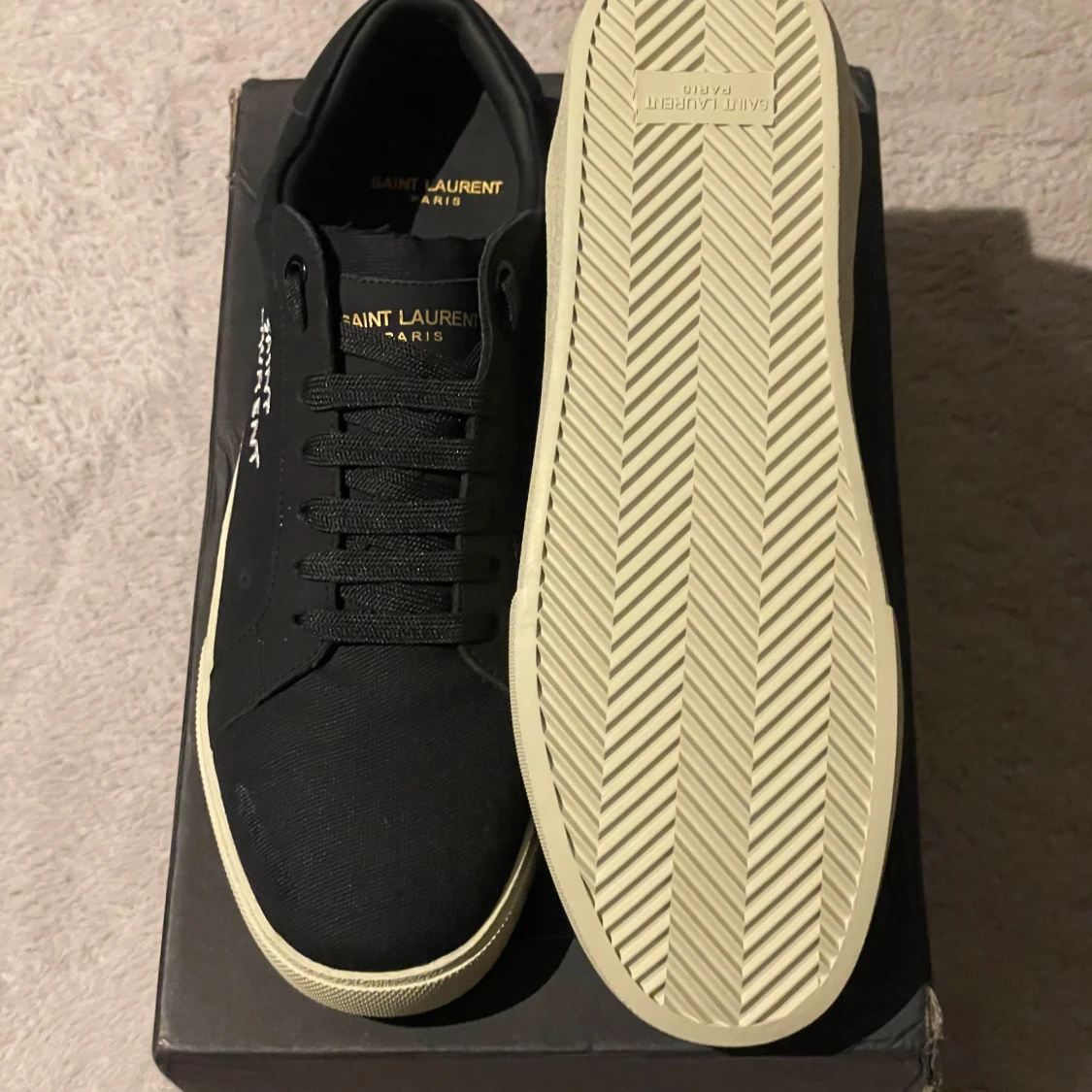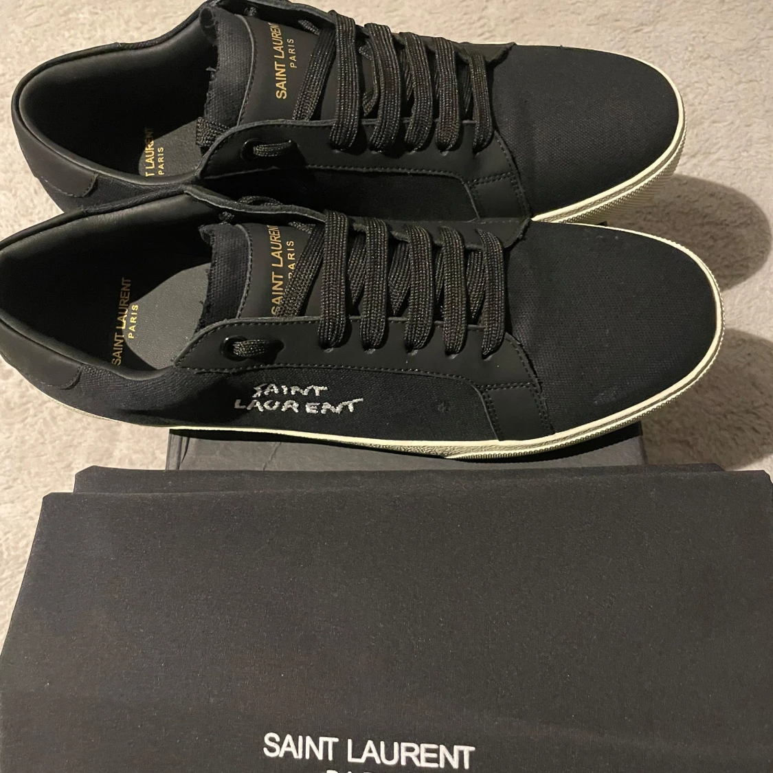 Snygga svarta sneakers från Saint Laurent med vit sula och diskret logga på sidan. Skorna har snörning och är perfekta för en stilren look.
