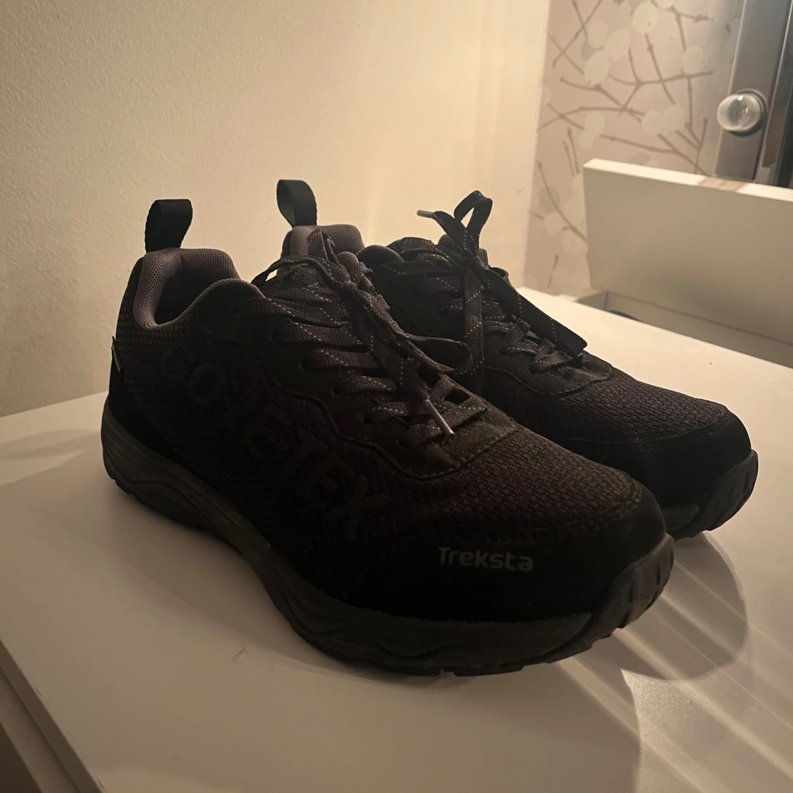 Snygga svarta sneakers från Treksta med GORE-TEX-material för extra väderskydd. Dämpande sula. Nyskick, nypris 1200
