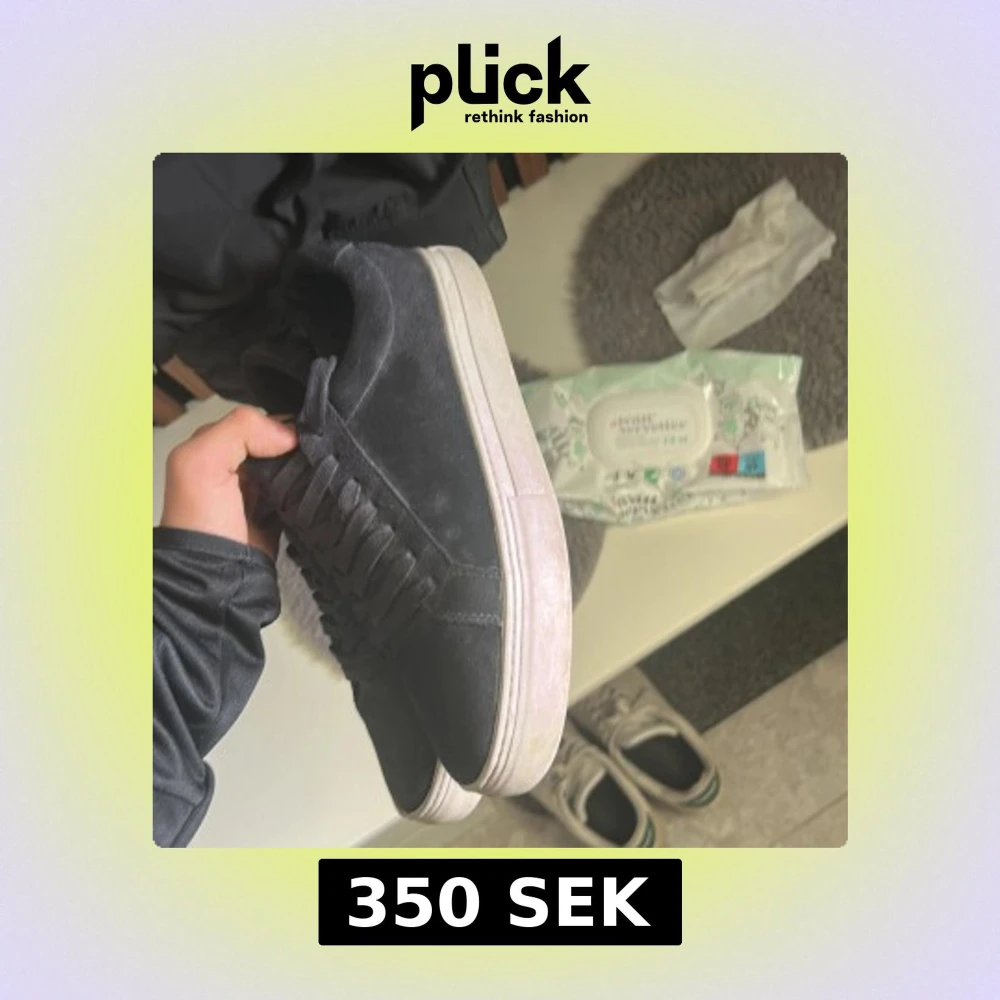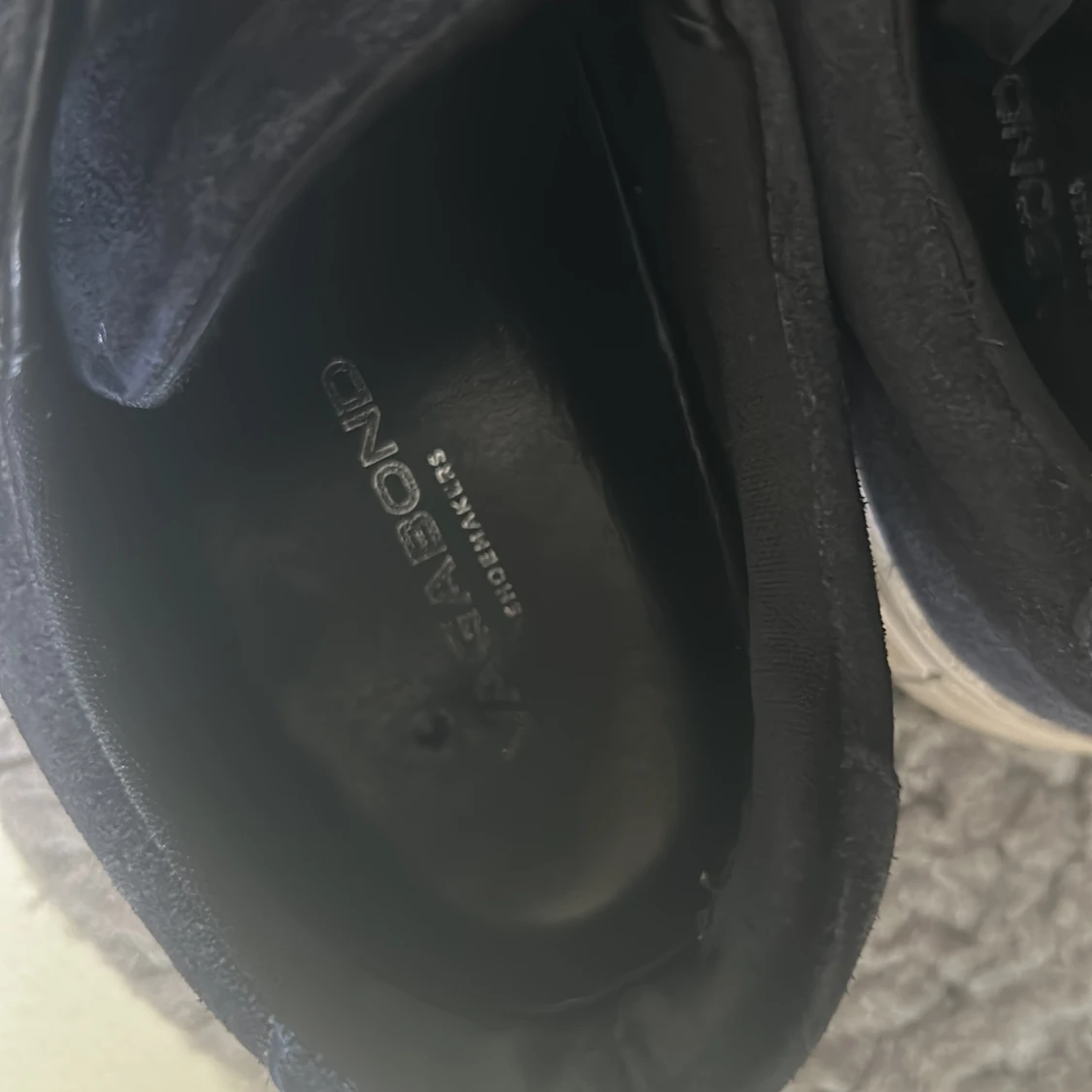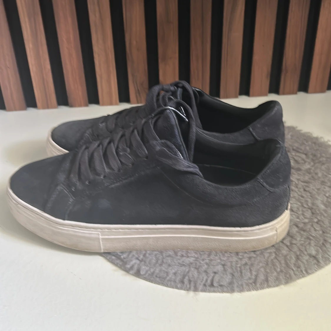 Säljer ett par svarta sneakers från Vagabond med ovandel i mocka och klassisk snörning. Skorna har en vit, platt sula och rund tå. Perfekta för en stilren och enkel look.