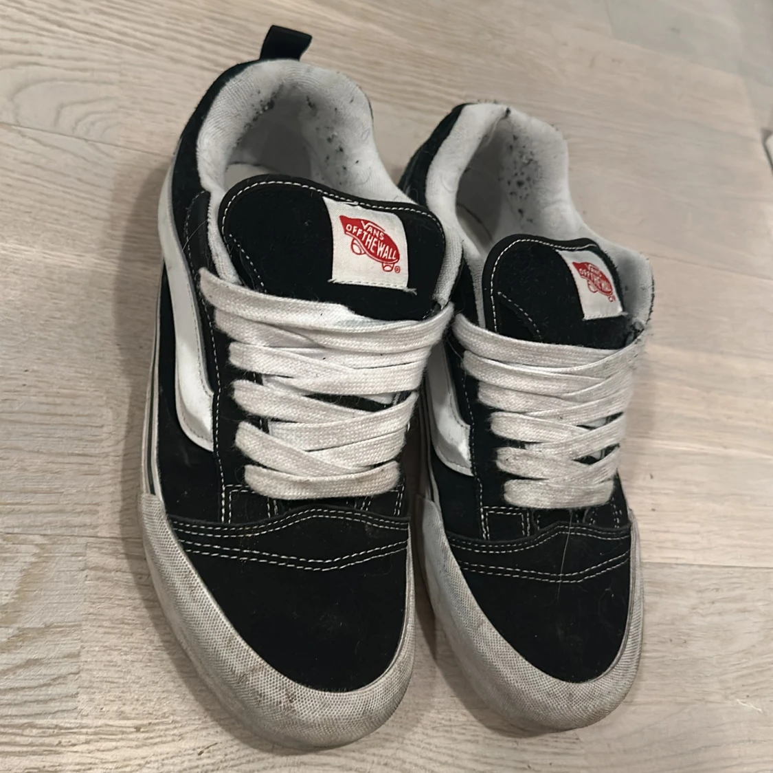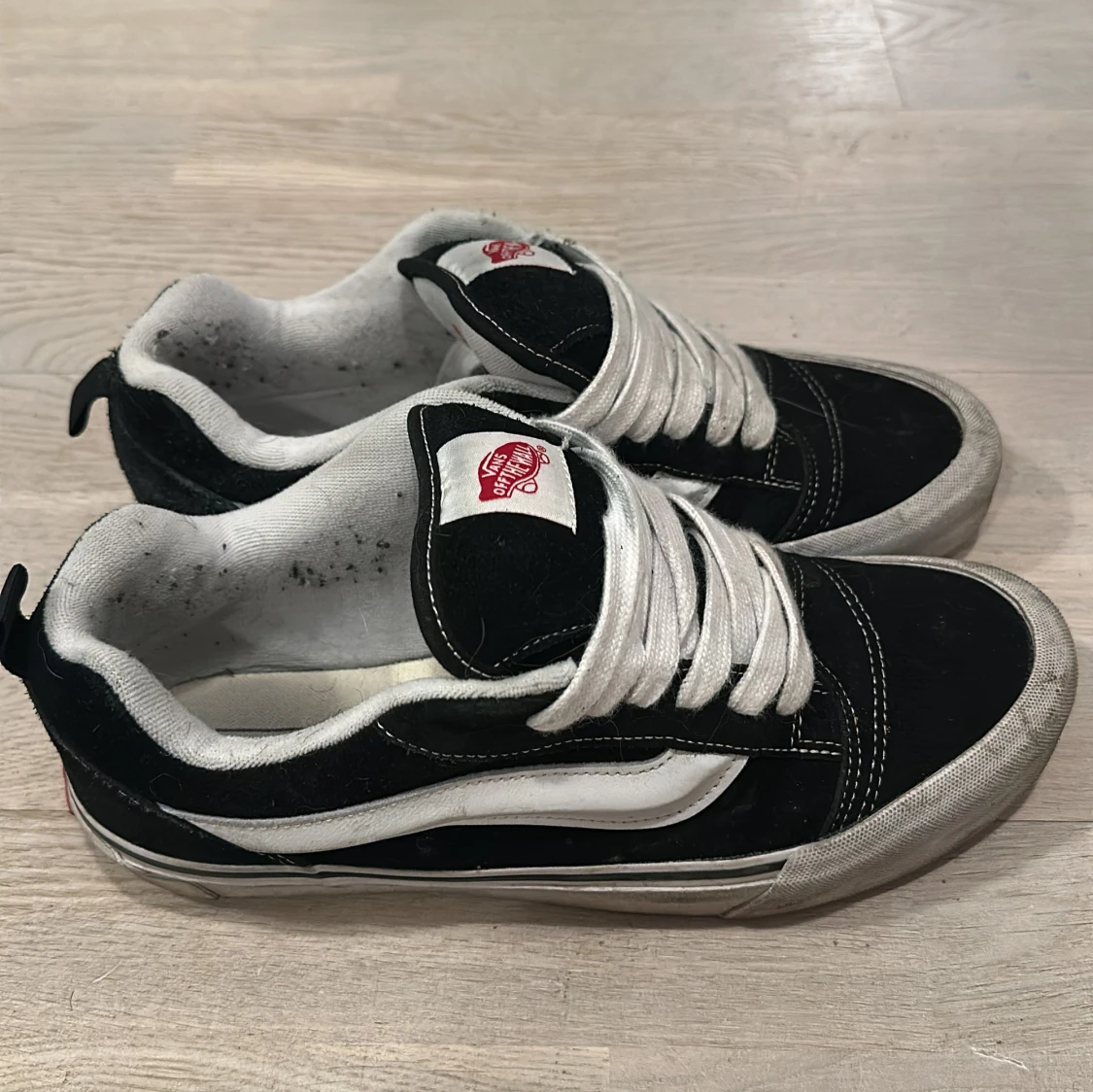 Säljer ett par klassiska svarta Vans sneakers med vit sula och snörning. Skorna har den ikoniska vita sidostripen och röd logga på plösen. Perfekta för en avslappnad stil.