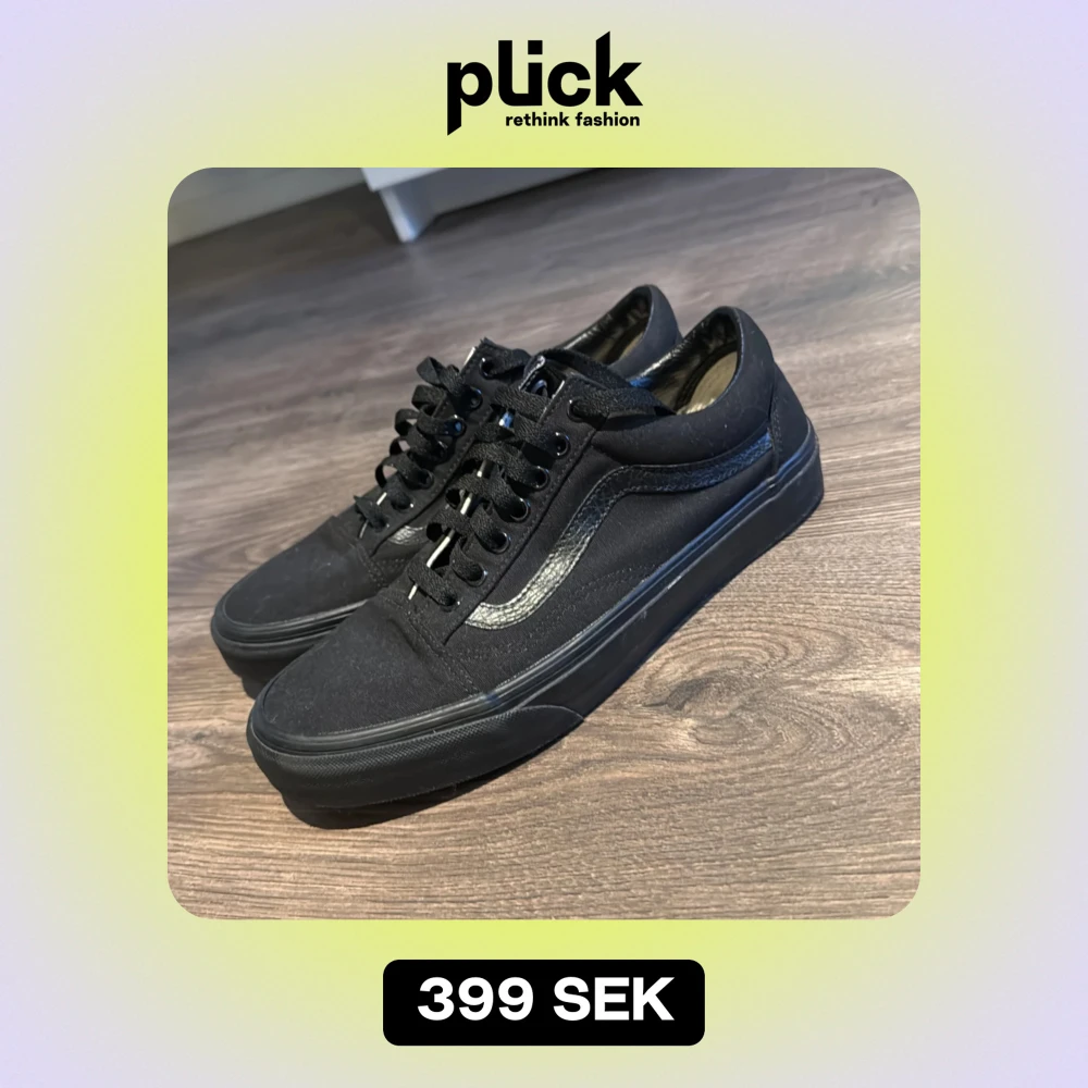 Säljer ett par klassiska svarta Vans sneakers i mycket bra skick. De har en stilren design med snörning och en diskret vågig detalj på sidan. Perfekta för vardagsbruk och passar till nästan allt. Storlek är inte angiven, men de ser ut att vara i standard herrstorlek.