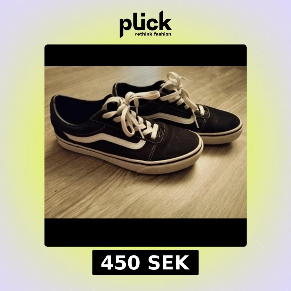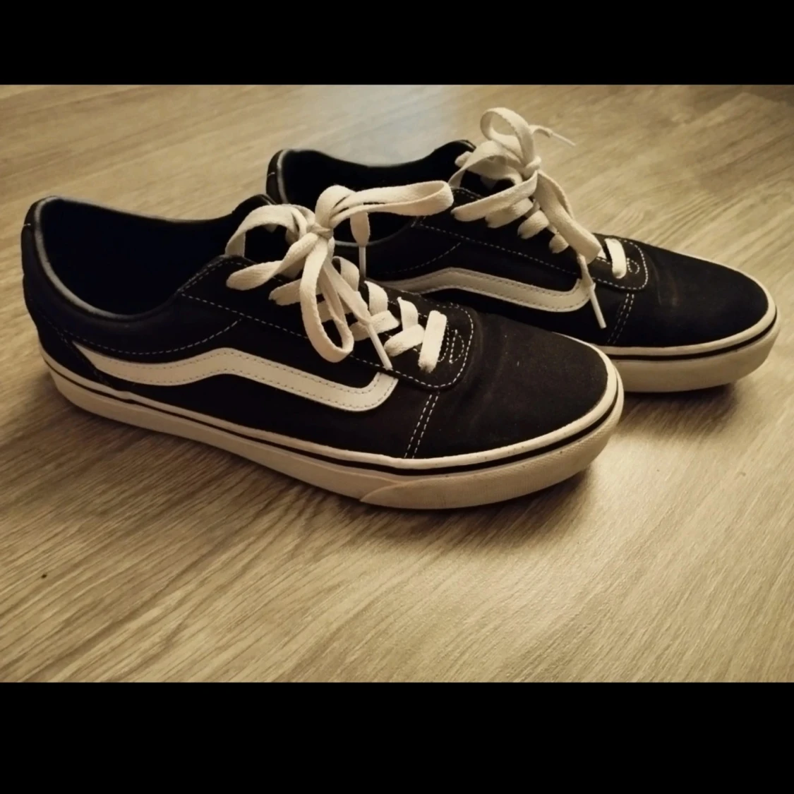 Klassiska svarta sneakers från Vans med vit sula och snörning. Skorna har den ikoniska vita sidostripen och är perfekta för en avslappnad stil.