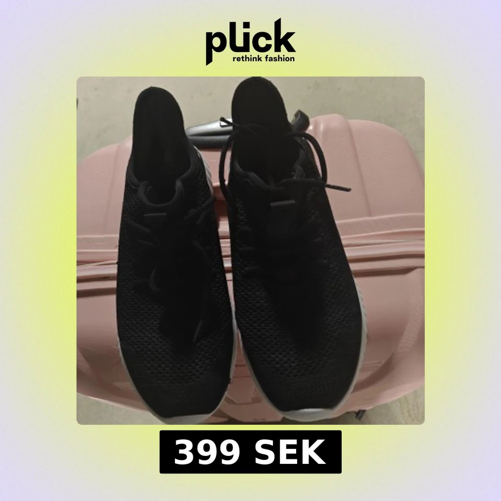 Svarta sneakers från Vty i storlek 45 med vit, vågformad sula och ovandel i mesh-liknande syntetmaterial. Skorna har snörning och röda detaljer på hälen. Perfekta för dig som gillar en sportig och clean look.