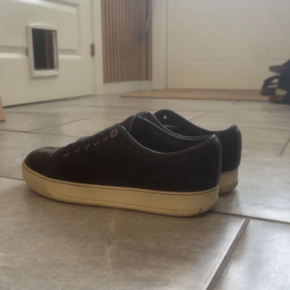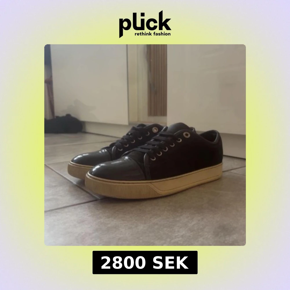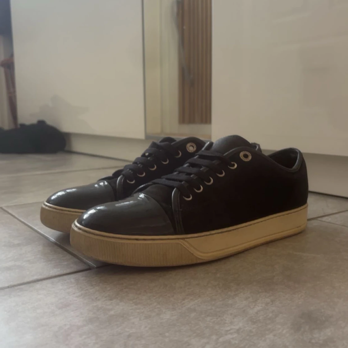 Snygga svarta sneakers med glansig tå och beige, lite tjockare sula. Skorna har klassisk snörning och metallfärgade öljetter. Perfekta för dig som gillar en stilren och enkel look med en twist. Passar till det mesta och är riktigt bekväma.