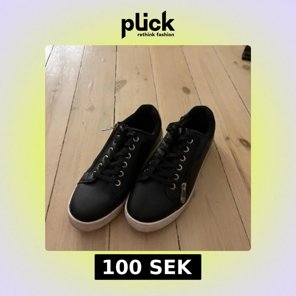 Svarta sneakers med vita sulor och snygga silverfärgade dragkedjor på sidan. Skorna har snörning framtill och rund tå. Perfekta för en stilren och urban look.