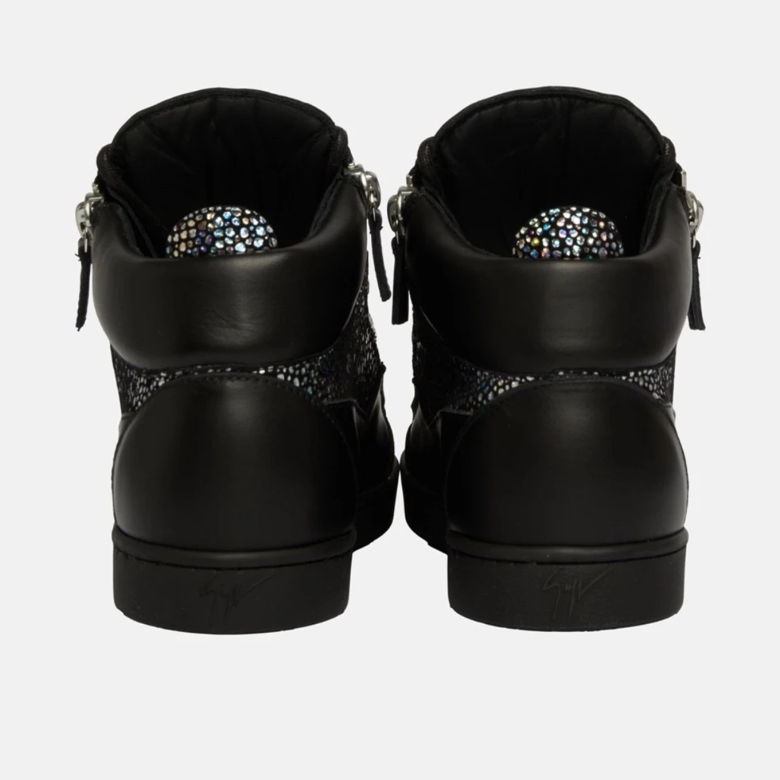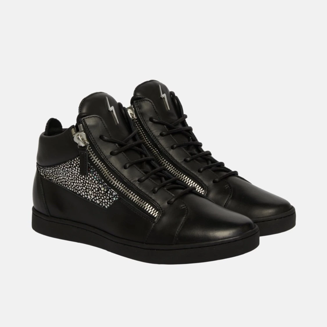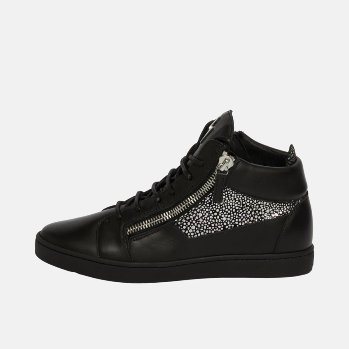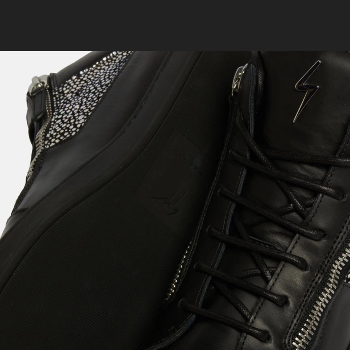 Snygga svarta giuseppe zanotti skor som är oanvända i skinn med coola dragkedjor på sidorna och glittriga detaljer som verkligen sticker ut. Perfekta för en fest eller när du vill ha en edgy look. De har snörning framtill och en bekväm passform.